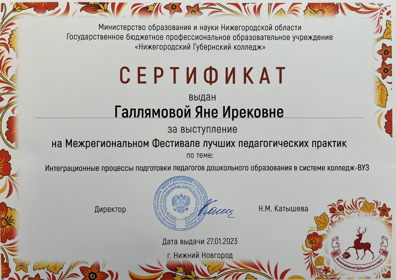 Преподаватель Галлямова Яна Ирековна, выступила с докладом: Интеграционные процессы подготовки педагогов дошкольного образования в системе «колледж-ВУЗ» на Межрегиональном Фестивале лучших педагогических практик г. Нижний Новгород с 26-27 января 2023.