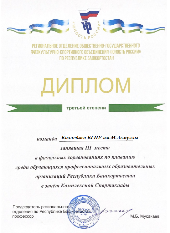Согласно плана работы Регионального отделения общественно- государственного физкультурно-спортивного объединения "Юность России" по Республике Башкортостан и календарного  плана третьего этапа Комплексной Спартакиады среди обучающихся профессиональных образовательных организаций Республики Башкортостан в городе Октябрьский прошли финальные соревнования по плаванию среди обучающихся в профессиональных образовательных организациях Республики Башкортостан. Участвовало 13 сильнейших команд, победителей второго этапа, завоевавших право участвовать в республиканских финальных соревнованиях. По итогам соревнований команда Колледжа БГПУ им.Акмуллы заняло третье место.