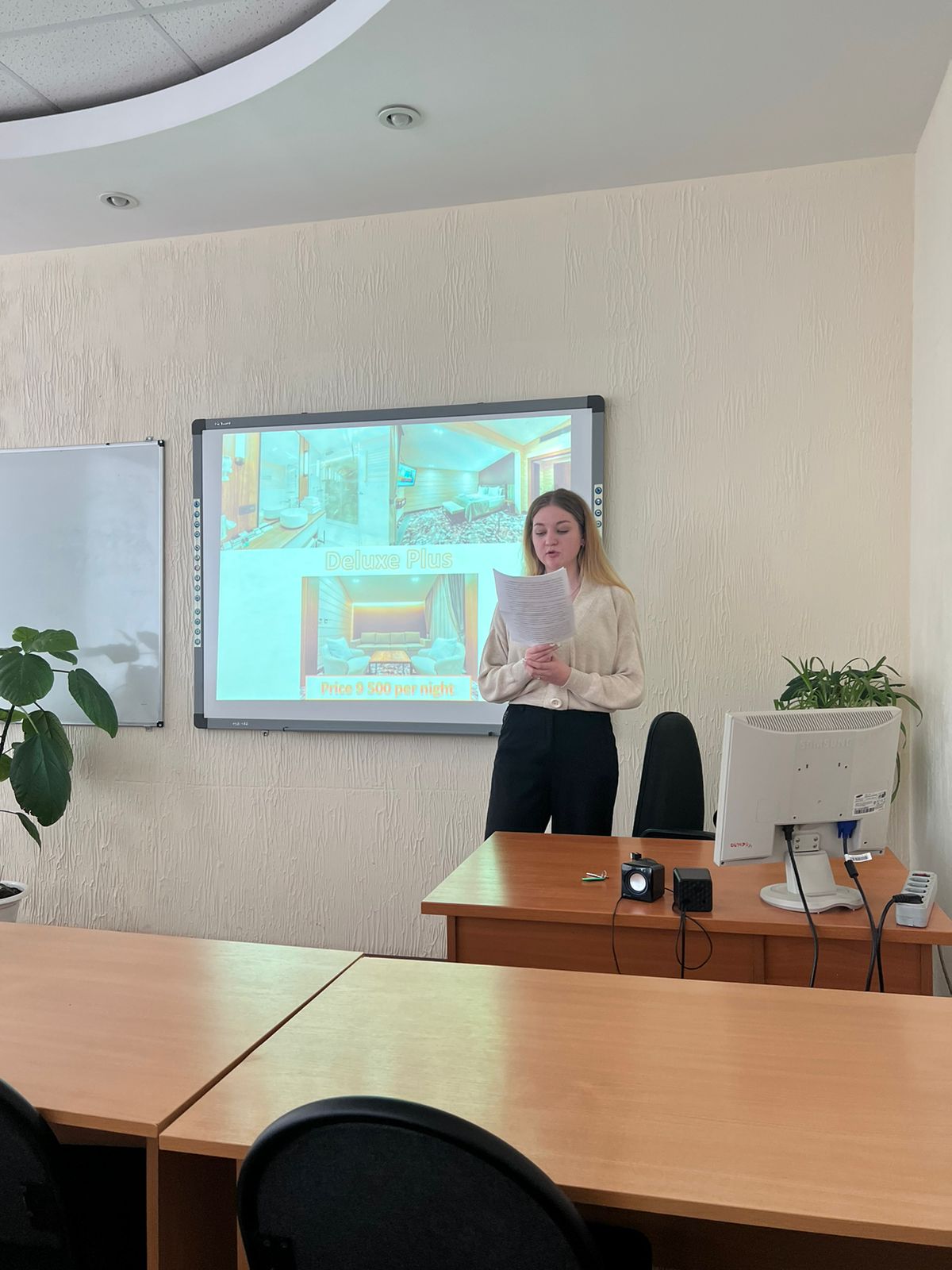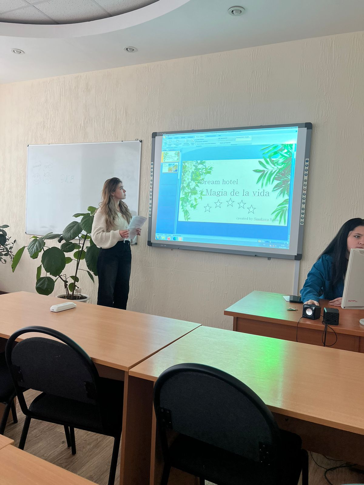 6 марта 2023 года в выпускной группе 9ГС-31-20(23) прошла традиционная защита студенческих проектов на английском языке «My Dream Hotel»(Отель моей мечты). Оценка работ была не только со стороны преподавателя Хабибуллиной  С.И., но и со стороны самих студентов. Студенческому творчеству не было предела: были представлены отели различных видов и звездности: Hobbit Hotel, Pearl Hotel, Magia de la Vida,  Cortez, Barbie House и другие. Наибольшее впечатление произвели отель Ивановой Вероники Feel Like a Star, в котором гости могли почувствовать себя настоящими звездами известных кинофильмов. Необычным и очень интересным был отель на дереве Каюмовой Элиры Lonataya по мотивам фильма «Аватар». Замечательные презентации и доклады показали Нигмадьянова Диана, Смакова Софья, Хасанова Миляуша. Защита проектов завершилась подробным анализом представленных работ и пожеланиями по их совершенствованию.  Залог успеха-это отличное знание дисциплины, к такому выводу пришли все выступающие.