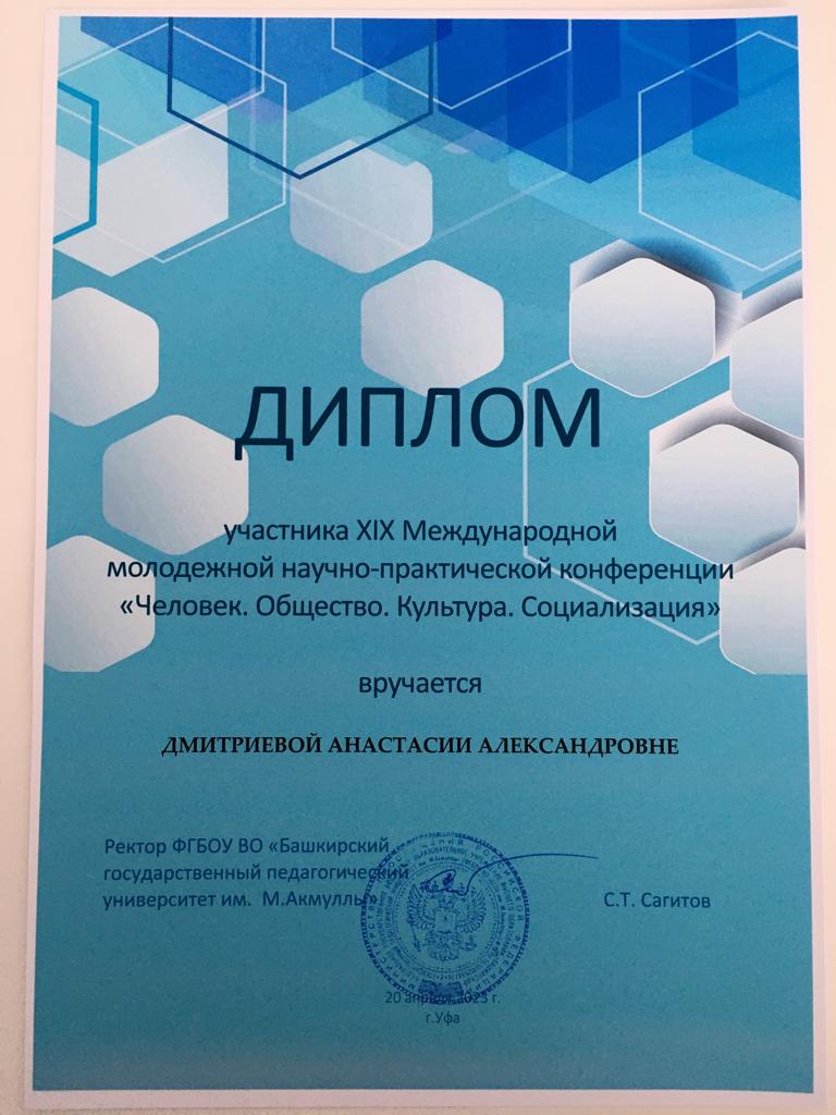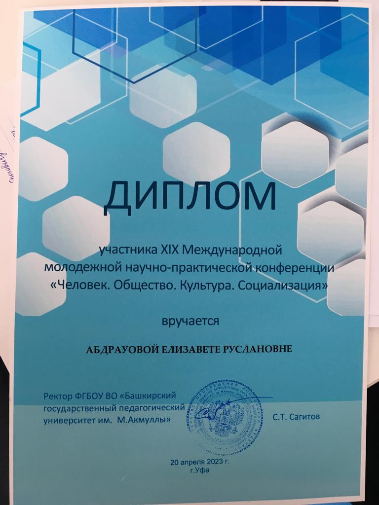 20 апреля 2023 года в Уфе прошла XIX Международная молодежная научно-практическая конференция «Человек. Общество. Культура. Социализация». Мероприятие состоялось на базе Института исторического, правового и социально-гуманитарного образования университета.