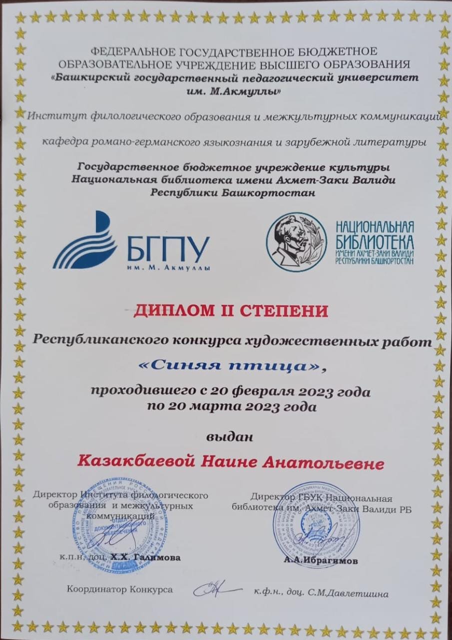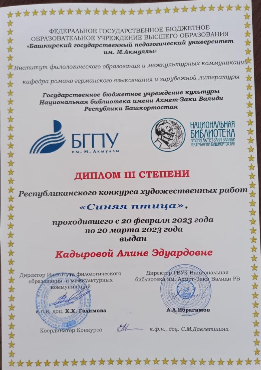 Студенты 1, 2, 3 курсов специальности «Изобразительное искусство и черчение» приняли активное участие в X Республиканском конкурсе художественных работ, посвященный 115-летию первой постановки пьесы бельгийского писателя Мориса Матерлинка «Синяя птица». Конкурс проходил с 20 февраля по 20 марта 2023 года на базе Института филологического образования и межкультурных коммуникаций БГПУ им. М.Акмуллы. Церемония награждения прошла 25 апреля в рамках Фестиваля «Франкофония 2023».