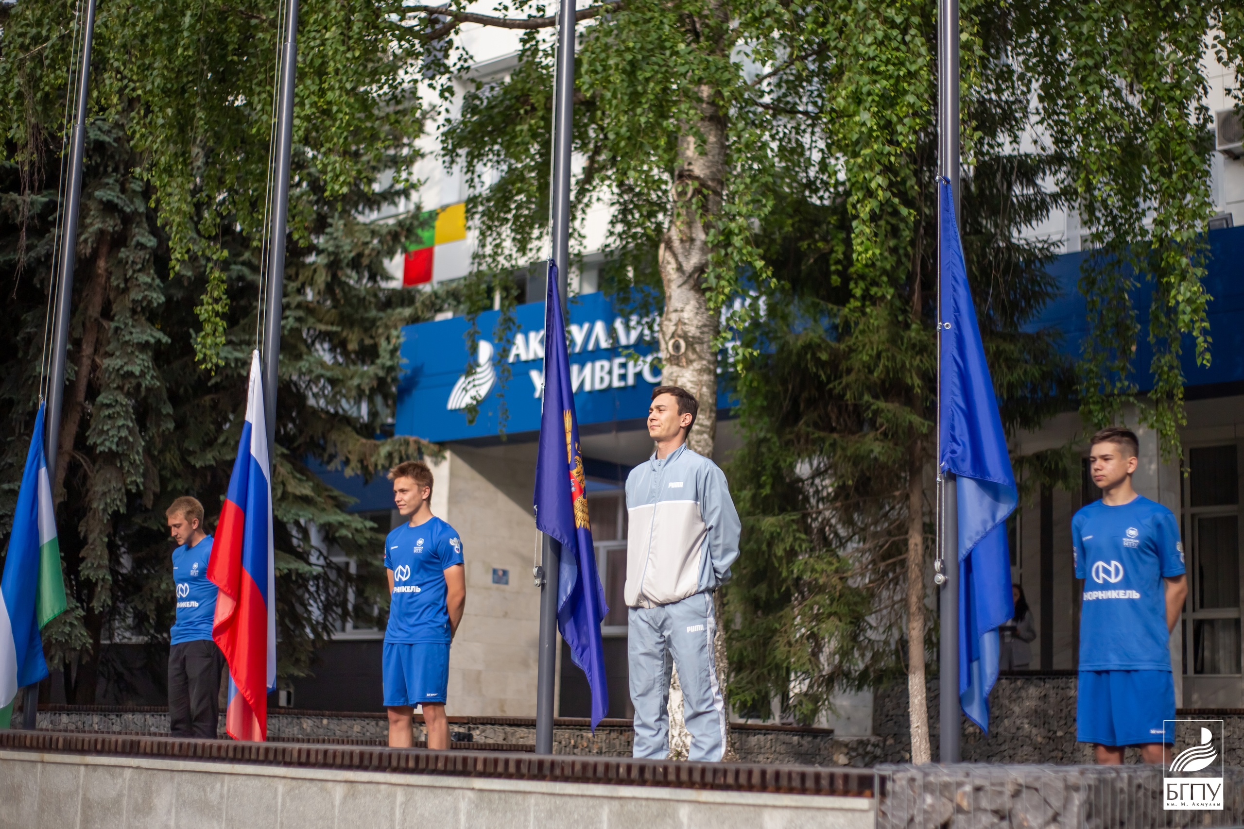 Почетное право поднять флаги предоставили команде Акмуллинского колледжа – призерам Всероссийского проекта «Мини-футбол – в вузы», проходившего с 10 по 26 мая в Нижегородской области. В финале Серебряной и Бронзовой лиг футболисты Колледжа БГПУ обыграли Гатчинский педагогический колледж со счетом 4:3.