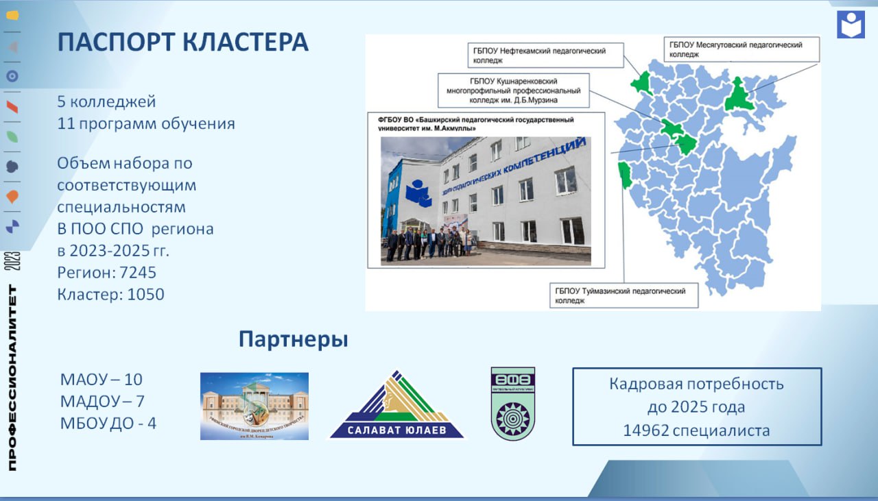 Республику Башкортостан представляли образовательные кластеры БГПУ им.М.Акмуллы, Уфимского и Стерлитамакского многопрофильных колледжей (отрасль «Педагогика»), а также Бирского медико-фармацевтического колледжей (отрасль «Клиническая и профилактическая медицина»).