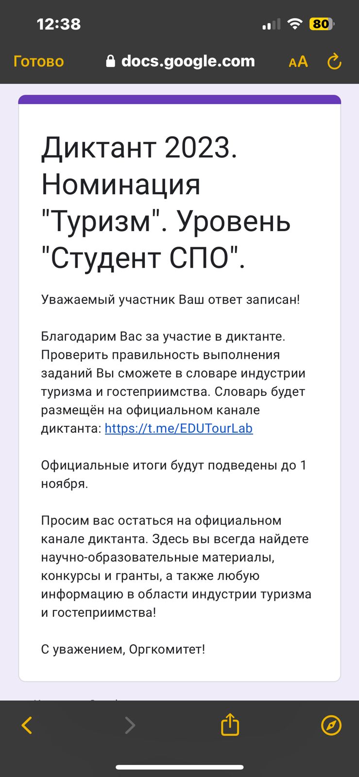 Вопросы были доступны с 10:00 до 24.00. Диктант проводится ежегодно как вид письменной работы для проверки и закрепления знаний в сфере туризма и гостеприимства. Номинации (Туризм или гостеприимство) и уровень студенты выбирали самостоятельно. Результаты выполнения заданий будут доступны на официальном канале Телеграмм 1 ноября 2023.
