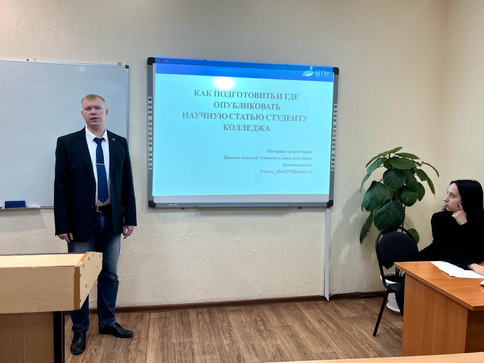 Как написать научную статью? Об этом, в ходе лекции, поделился опытом и дал свои рекомендации кандидат исторических наук, преподаватель колледжа Алексей Олегович Иванов. Студенты узнали также, как выбрать тему и научного руководителя, источники и технологию выбора конференций для участия в них.