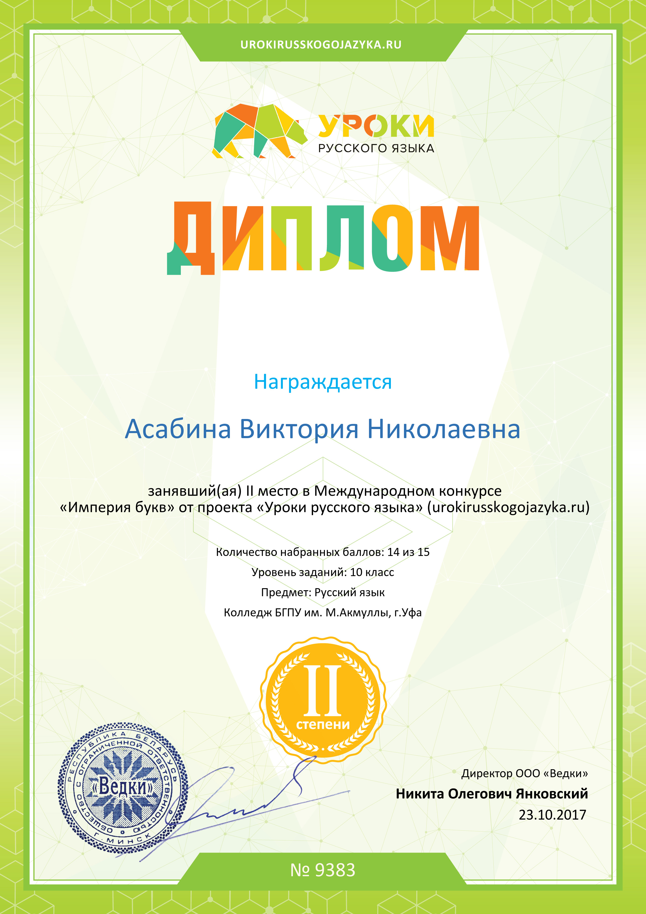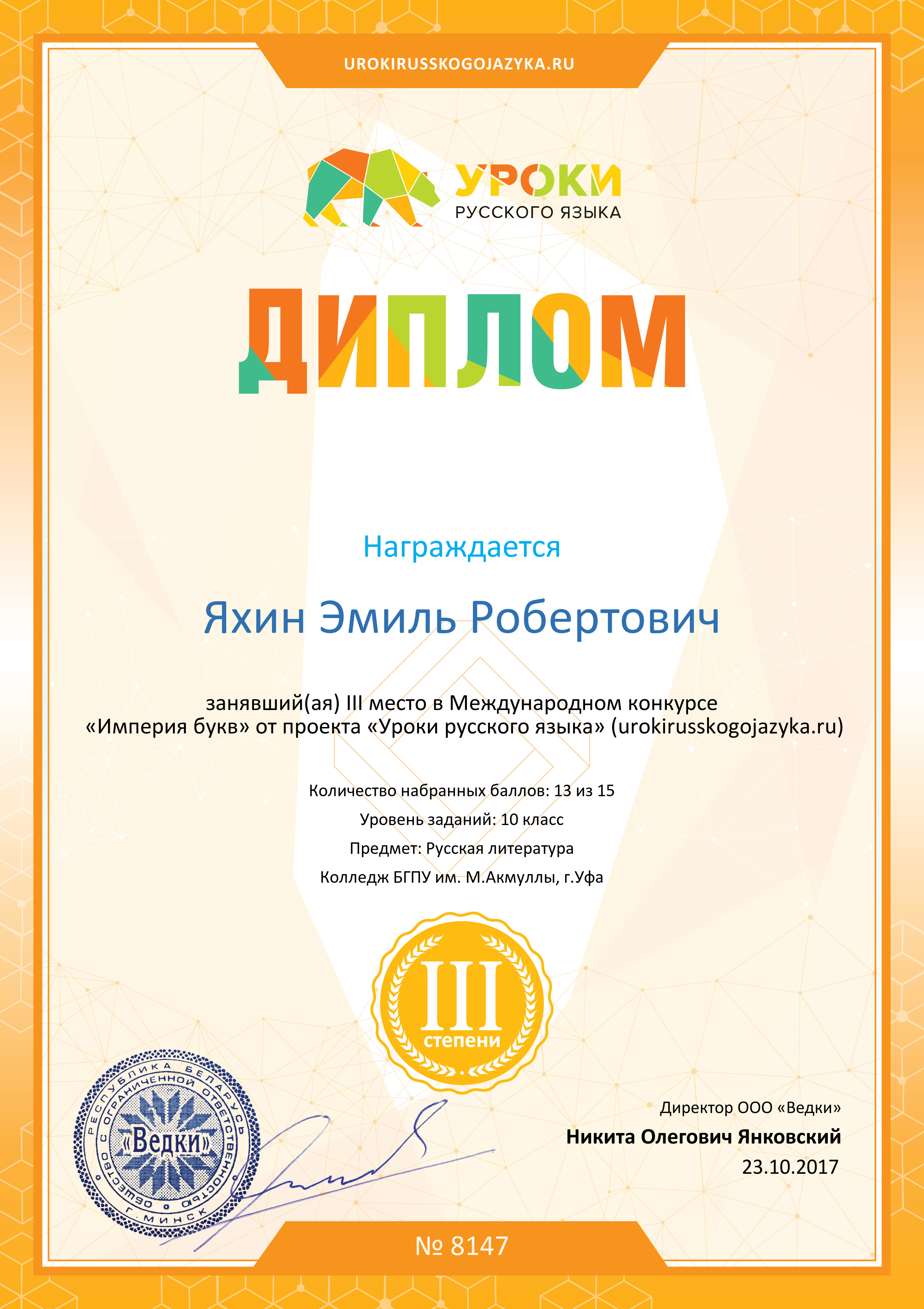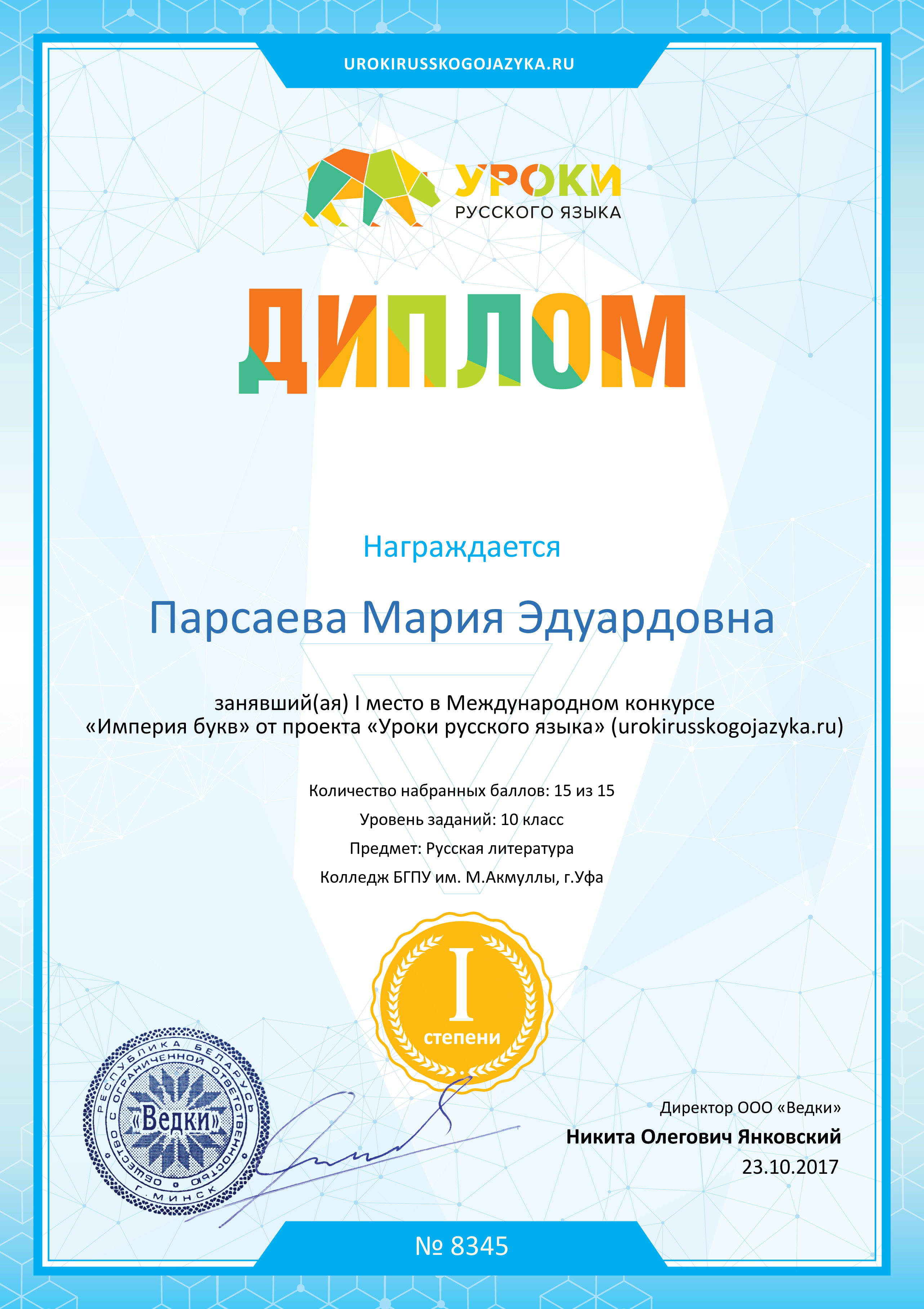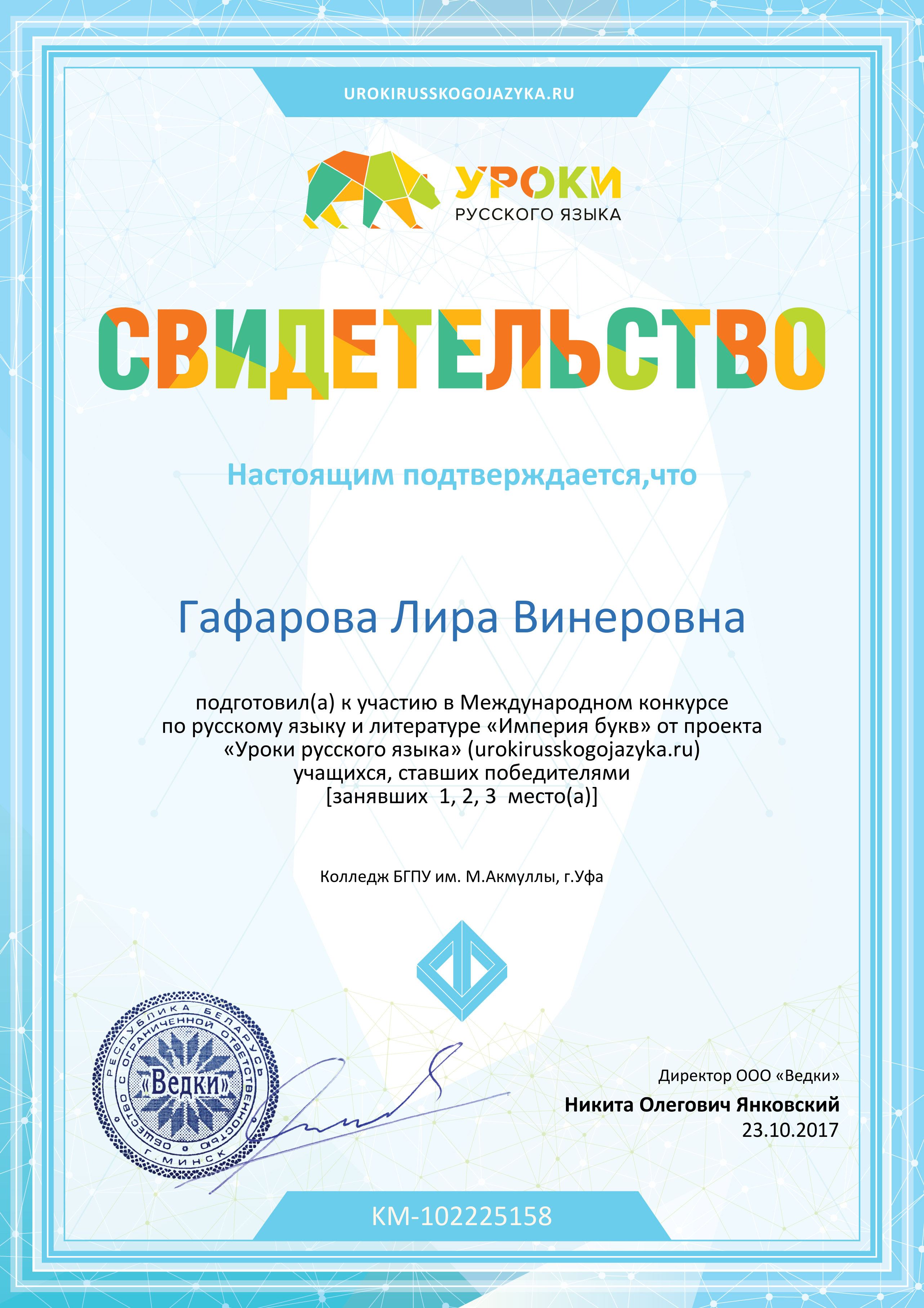 Поздравляем победителей Международного конкурса по русскому языку и литературе  «Империя букв»  (руководитель Л.В.Гафарова) от проекта «Уроки русского языка»: