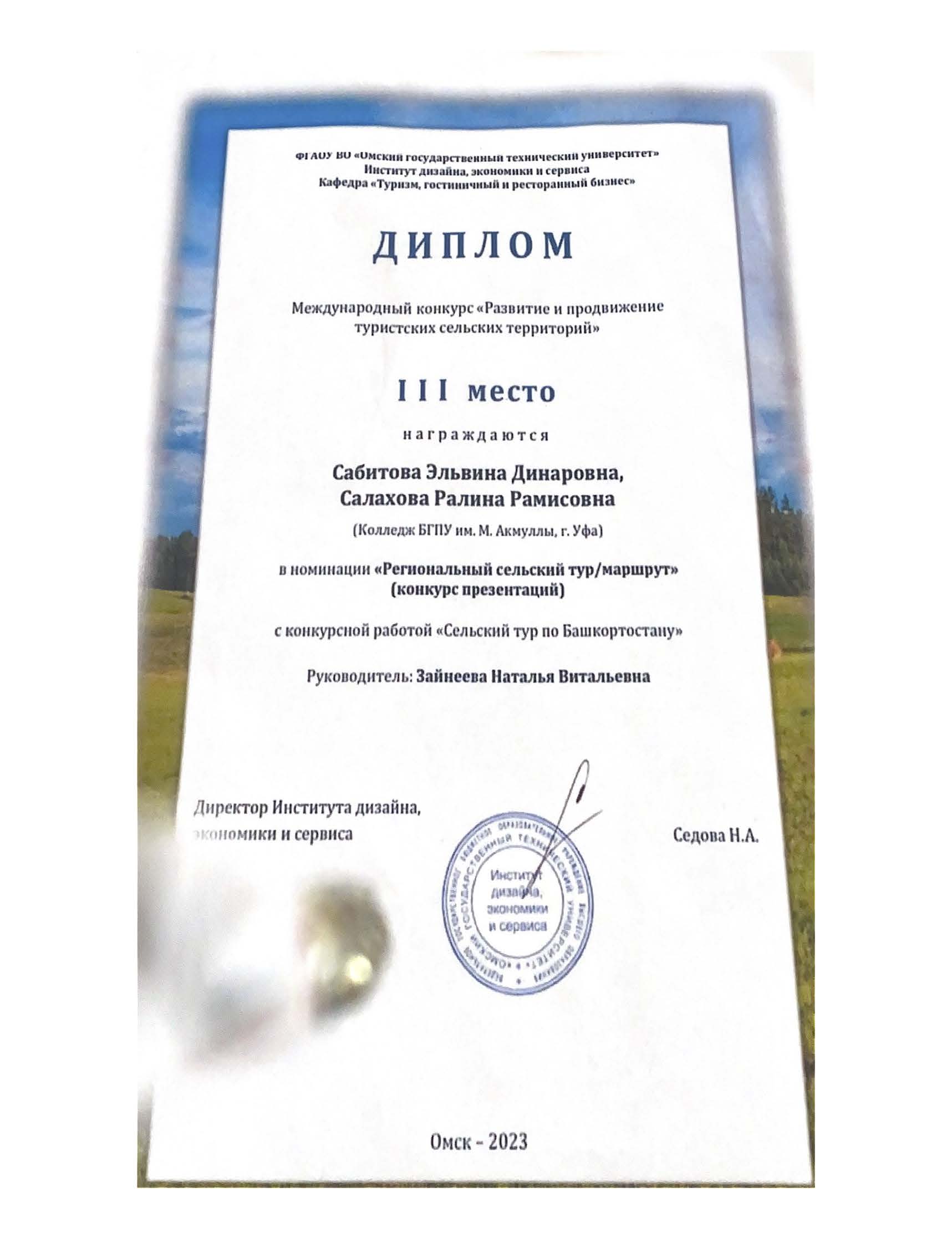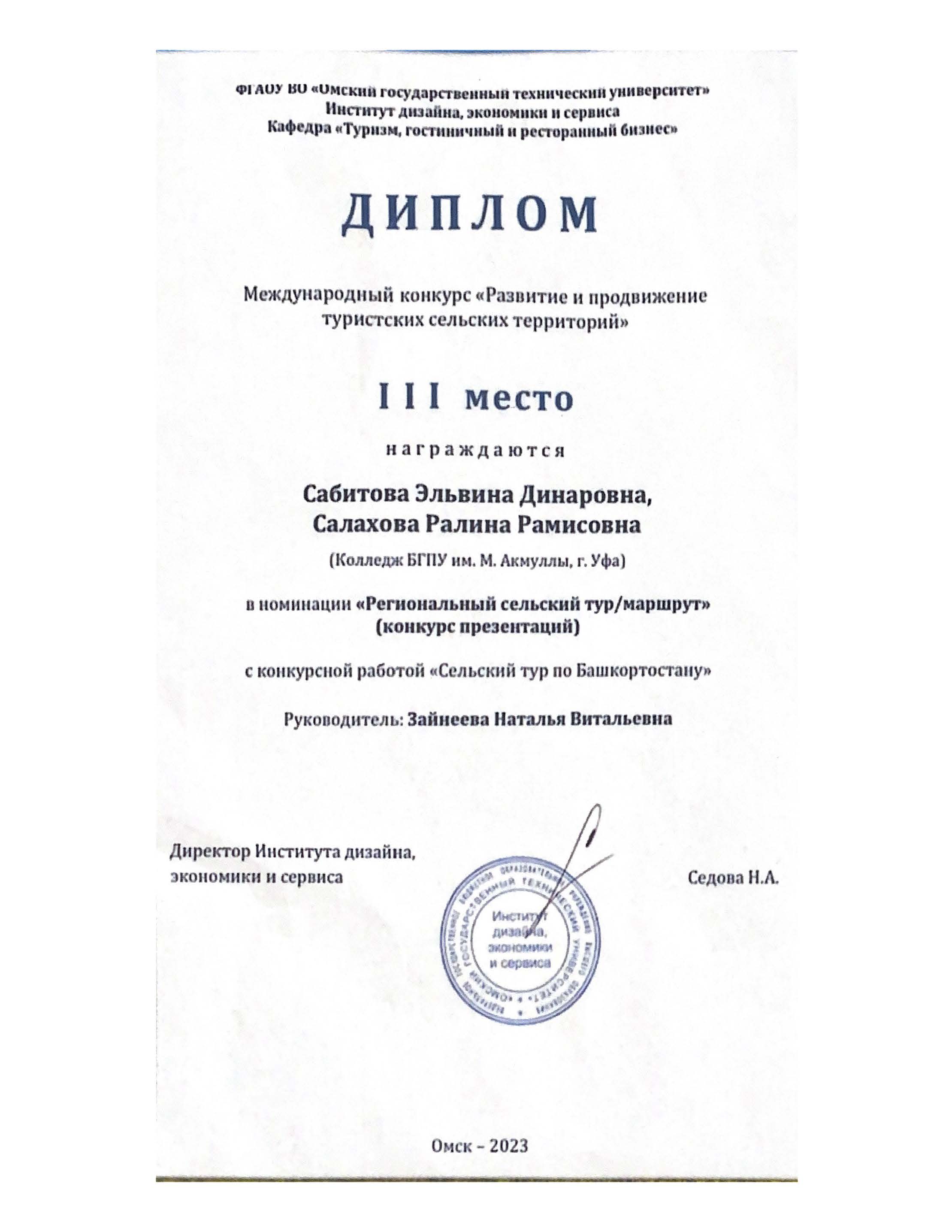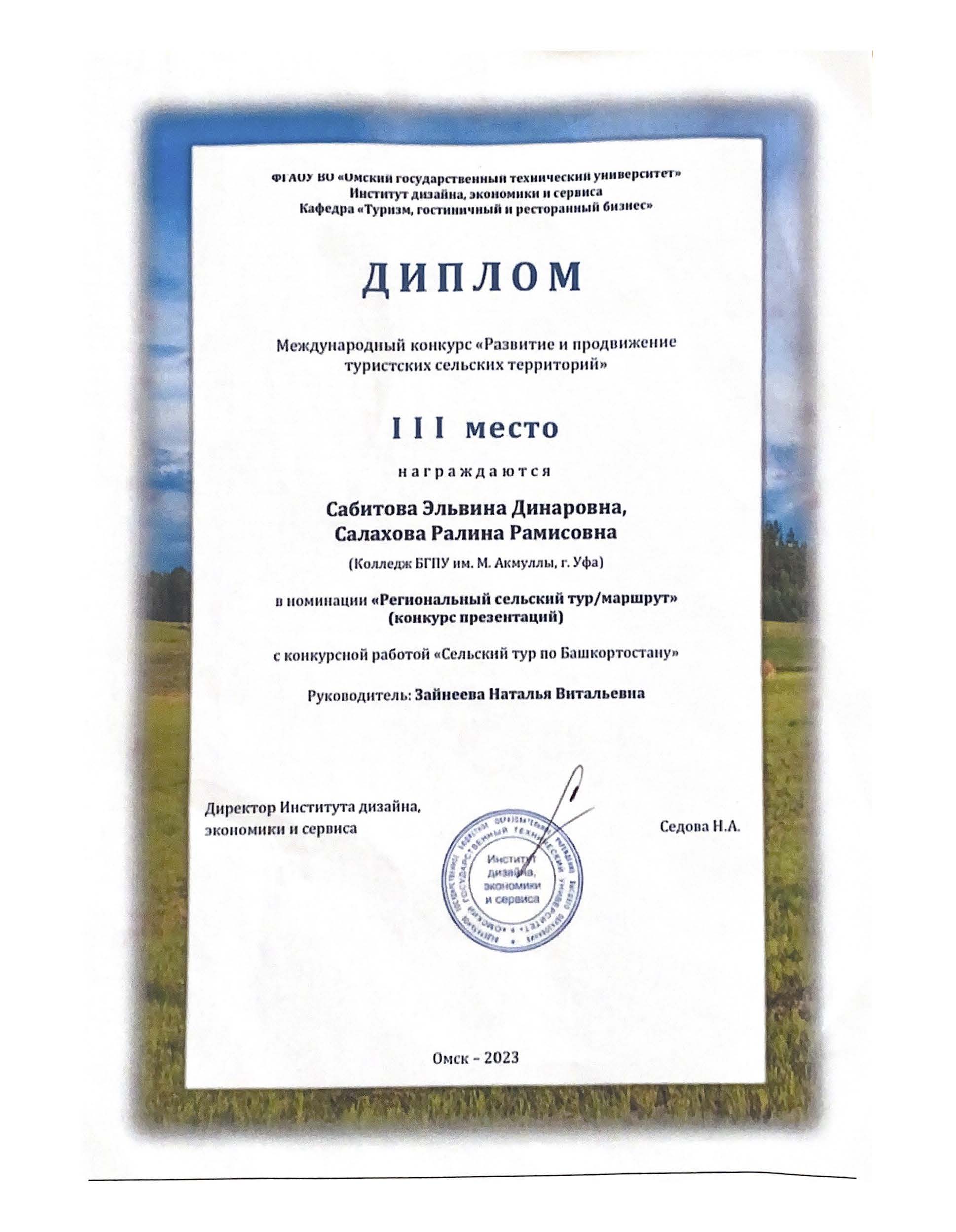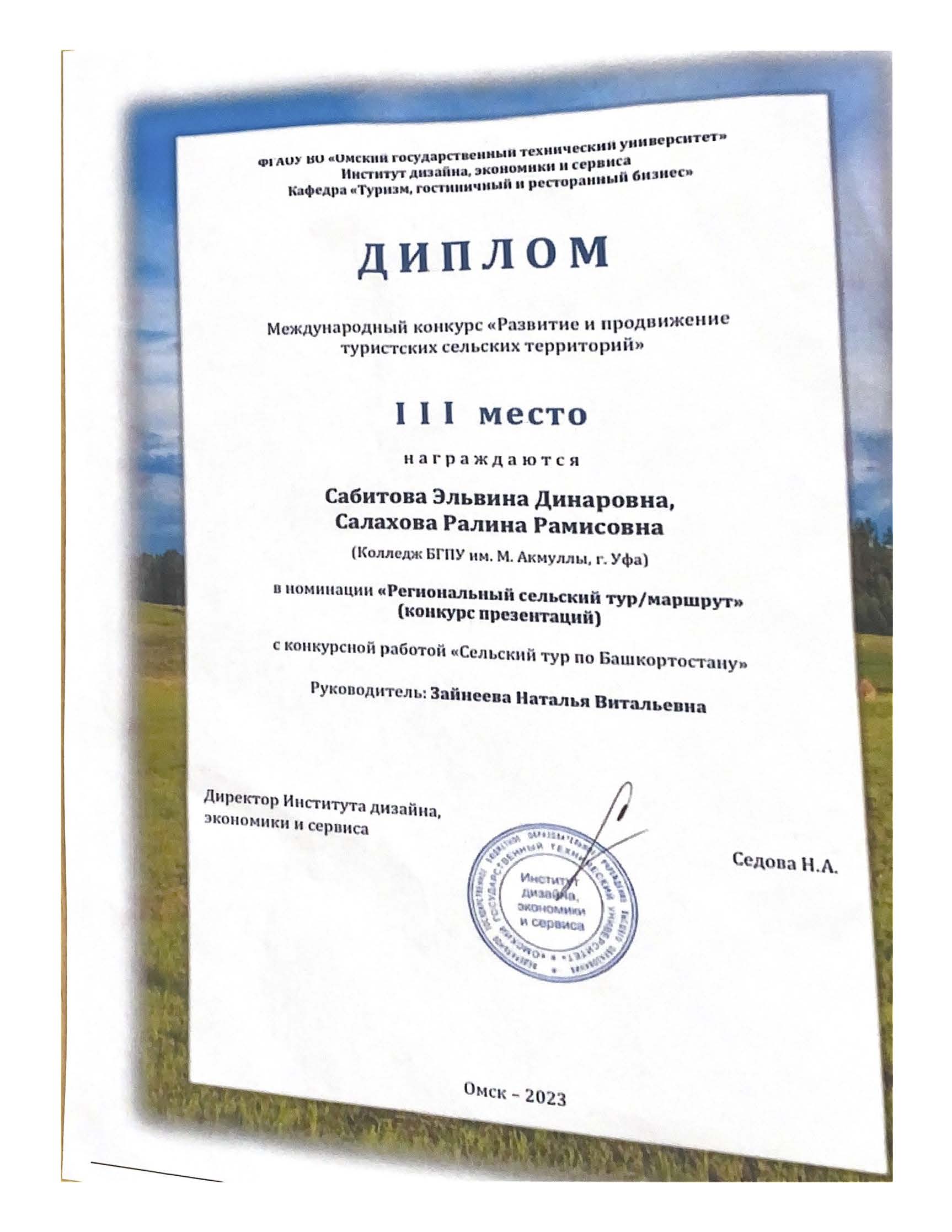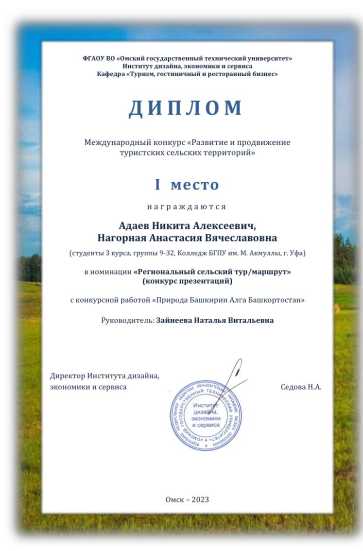 Студенты специальности «Туризим» Адаев Никита и Нагорная Анастасия; Сабитова Эльвина и Салахова Ралина приняли участие и стали призерами ( 1 и 3 места соответственно) в международном конкурсе « Развитие и продвижение сельских территорий» под руководством Зайнеевой Натальи Витальевны.