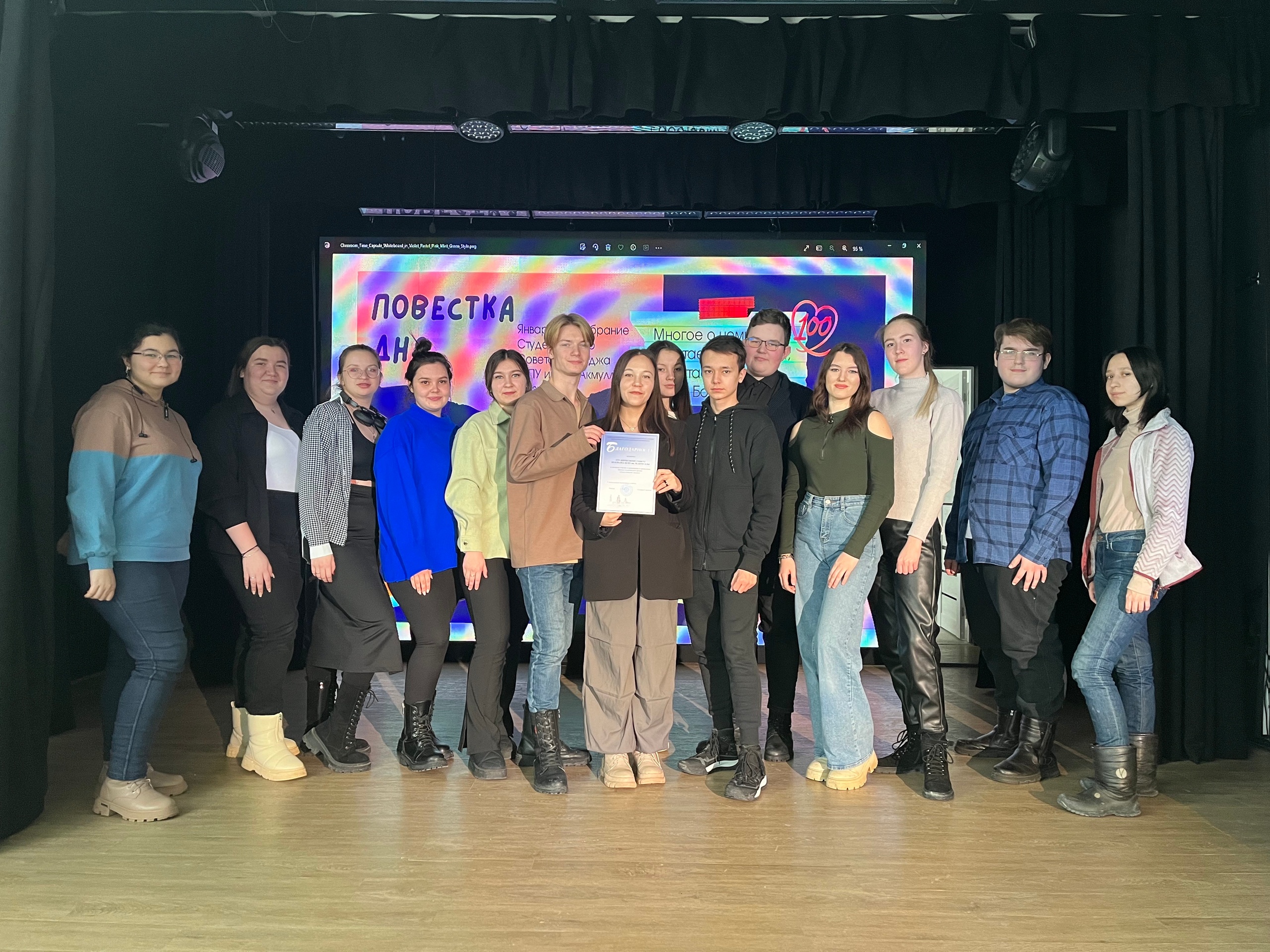 На Квартирнике в Акмуллинском, прошедшем 25 января, Студенческий Совет Колледжа наградили за активное участие в проведении школы студенческих активов «Акмуллинские лидеры», став одними из лучших в ее организации!