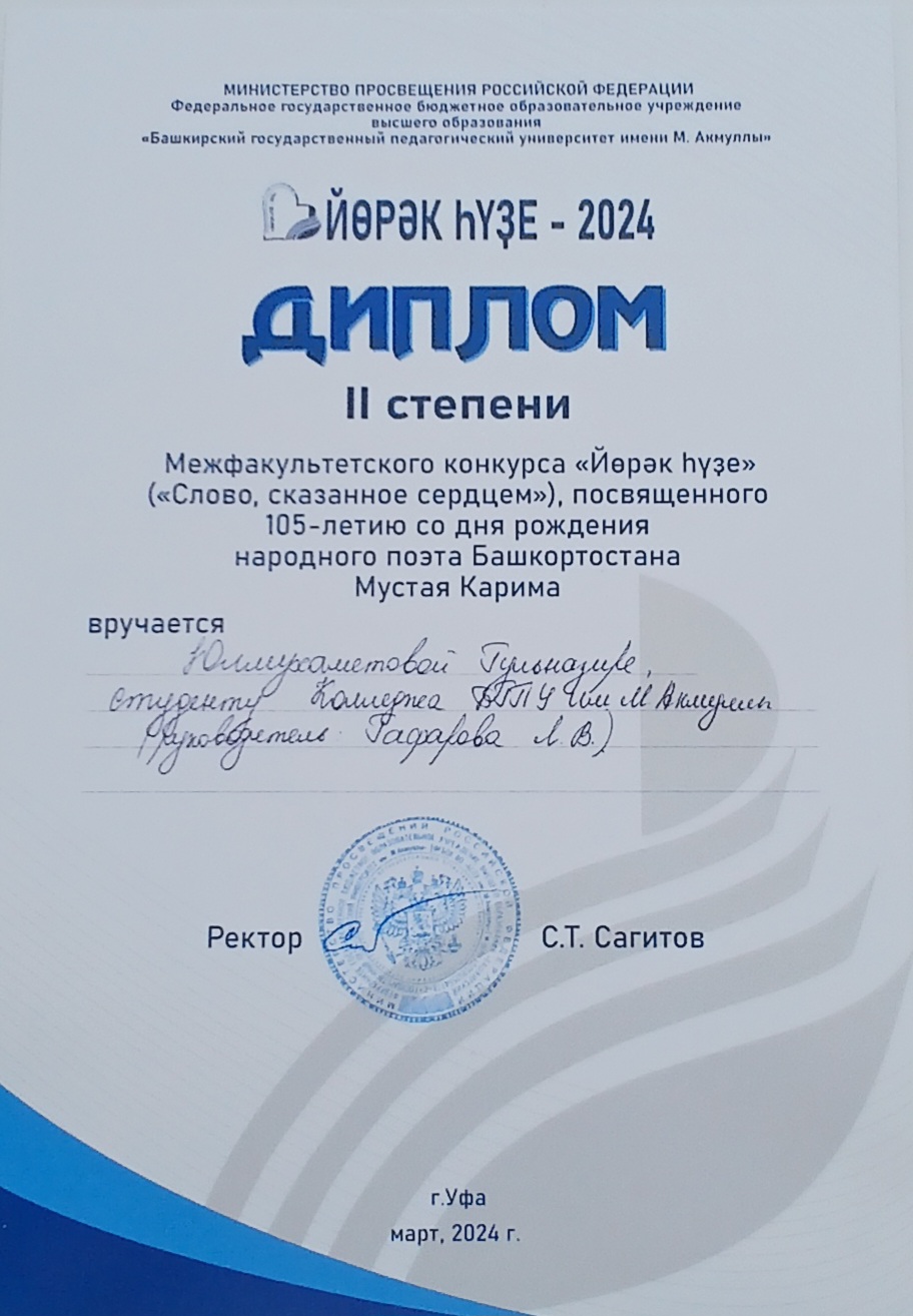 21 марта 2024 г.  в БГПУ им. М. Акмуллы состоялся II тур (очный) Межфакультетского конкурса «Йөрәк һүҙе» («Слово, сказанное сердцем»), посвященного 105-летию со дня рождения народного поэта Башкортостана Мустая Карима, и торжественное награждение победителей конкурса. Цель конкурса – пропаганда и популяризация башкирского языка, повышение общественного интереса к литературному творчеству Мустая  Карима, сплочение, расширение круга интересов студенческой молодежи Акмуллинского университета, содействие в удовлетворении их духовных, интеллектуальных, творческих и социальных потребностей, сохранение и изучение башкирского языка как родного и государственного языка, повышение интереса в вопросе изучения башкирского языка, развитие интереса к изучению и развитию национальной культуры.