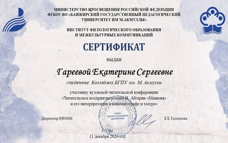 На базе Башкирского государственного педагогического университета им. М.Акмуллы, прошла читательская конференция «Читательское восприятие романа Н. Абгарян «Манюня» и его интерпретация в кинематографе и театре». Преподаватель русского языка и литературы,  Крыжаноская Юлия Валерьевна и студенты групп 9ПСО-11, 9ПНК-11 Гареева Екатерина, Рамазанова Диана и Оганесян Марина приняли активное участие со своим докладом «География романа Наринэ Абгарян «Манюня»»,  за что получили благодарственные письма и приз зрительских симпатий.
