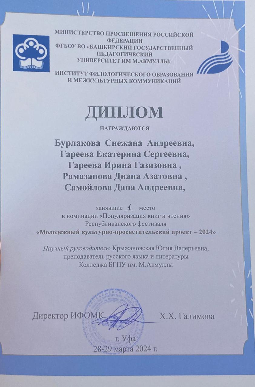 28 марта 2024 года на базе Башкирского государственного педагогического университета им. М.Акмуллы прошел Республиканский фестиваль «Молодежный культурно-просветительский проект – 2024». Несмотря на то, что конкуренция среди участников была очень высокая, студенты нашего колледжа Гареева Екатерина, Рамазанова Диана ( 9ПСО-11), Бурлакова Снежана ( 9ИЗО-21) и учащаяся 9- го  класса средней школы г.Уфы Самойлова Дана с проектом «В мире сказок Корнея Ивановича Чуковского» стали победителями этого фестиваля (1 место). А студенты группы 9ДОУ-11 Адраширова Лия, Исламова Диана и Марченко Анастасия заняли 3 место с проектом «Сказки Александра Сергеевича Пушкина» (научный руководитель Крыжановская Юлия Валерьевна).
