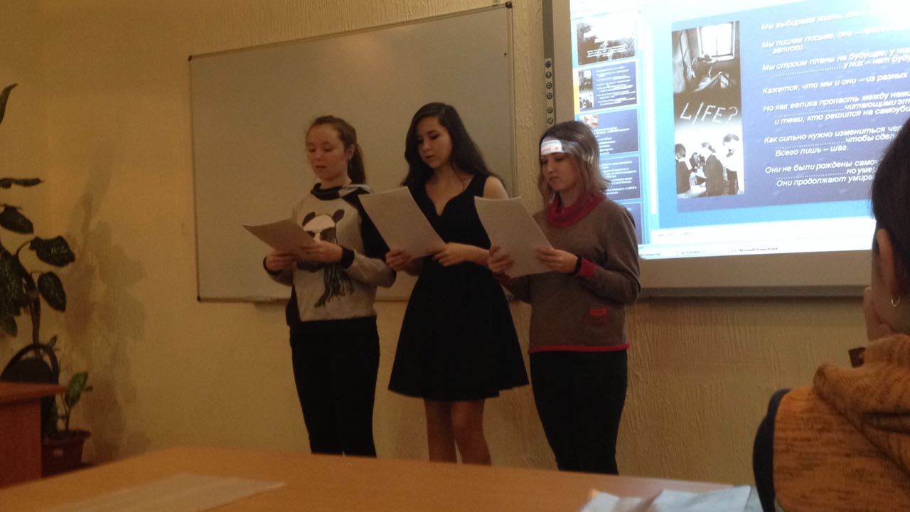 30 ноября 2017 года в Колледже БПУ им. М.Акмуллы, в рамках месячника по профилактике суицида в подростковой среде, состоялся классный час на тему «Суицид. Причины возникновения. Пути решения проблемы». Студенты группы 9Т-11 (куратор Л.В.Гафарова) ознакомились со статистикой совершенных суицидов, причиной их возникновения, о влиянии некоторых групп социальных сетей на подсознание подростков, а также провели интерактивную беседу «Признаки суицидального поведения» и тренинг «Мы не одиноки».