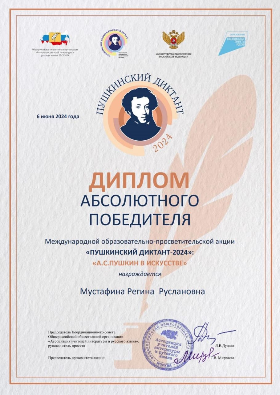 Были объявлены итоги Международной просветительской акции «Пушкинский диктант – 2024». Организатором данного мероприятия является Общероссийская общественная организация «Ассоциация учителей литературы и русского языка» (АССУЛ). В этом году «Пушкинский диктант» вошел в серию мероприятий Всероссийского образовательно-просветительского фестиваля «Пушкинское слово в красках и звуках» и проводился при поддержке Министерства просвещения Российской Федерации в рамках Национального проекта «Образование», приуроченного к празднованию 225-летия со дня рождения А.С. Пушкина. Студенты 1 курса специальностей «Библиотековедение», «Туризм и гостеприимство» Колледжа БГПУ им. М.Акмуллы под руководством преподавателя Гафаровой Л.В. приняли активное участие и показали следующие результаты: