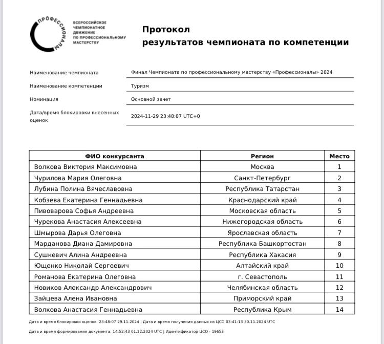 Финал Чемпионата "Профессионалы" по компетенции "Туризм" прошел в КВЦ "ЭКСПОФОРУМ" г.Санкт-Петербург с 26 по 30 ноября 2024 года.