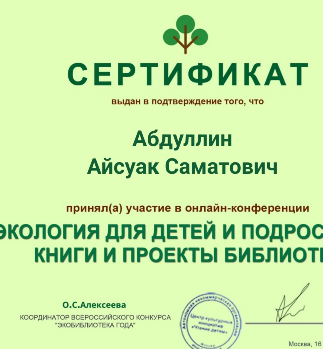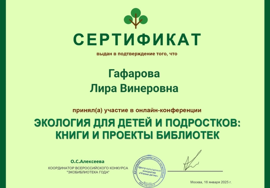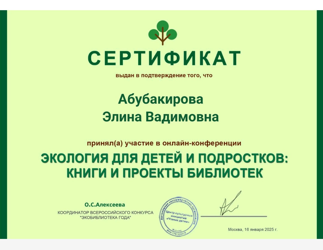 18 января 2025 года состоялась онлайн - конференция "Экология для детей и подростков: книги и проекты библиотек». Организатор - электронный журнал «Чтение детям». Это мероприятие проводилось в рамках VII Всероссийского конкурса "ЭкоБиблиотека года". Программа конференции включала презентации эко-проектов библиотек-победителей конкурса и выступления спикеров на темы: «Экология и природа в фотообъекте», «Книги о море», «В экологию через книгу: формирование экологической культуры школьников средствами художественной литературы» и др.