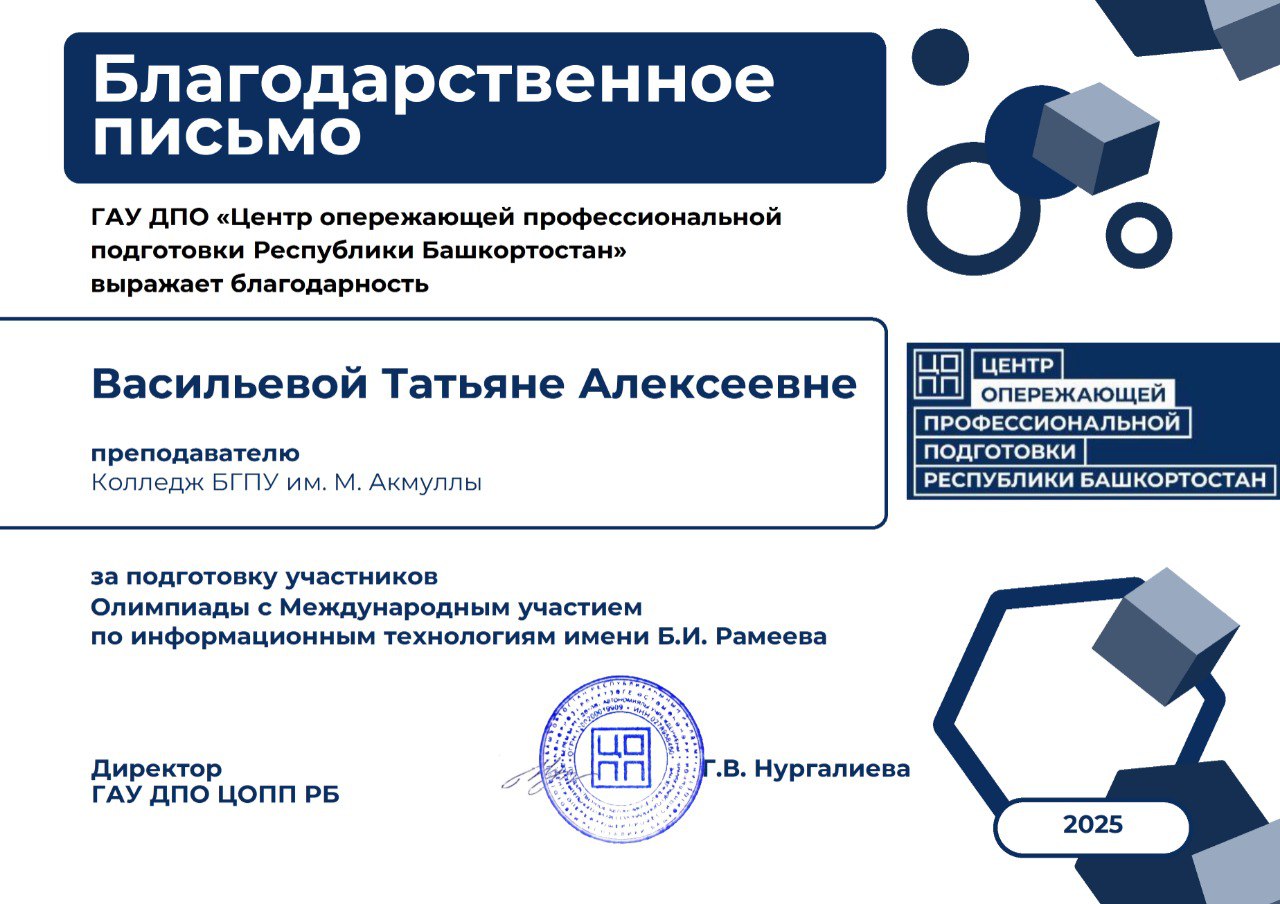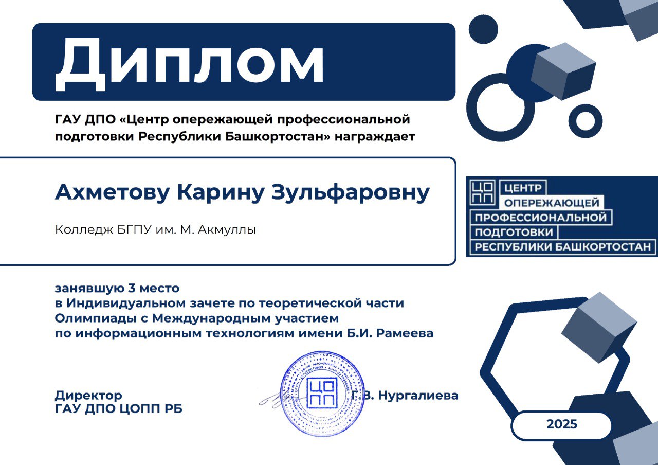 13 марта 2025 года студенты второго курса специальности 09.02.07 Информационные системы и программирование» приняли участие в Олимпиаде с Международным участием по информационным технологиям имени Б.И. Рамеева на базе ГБПОУ Уфимский колледж радиоэлектроники, телекоммуникаций и безопасности.
