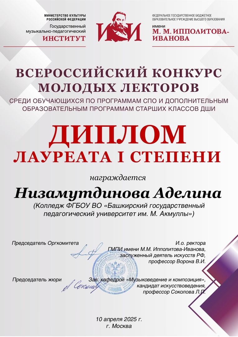 10 апреля 2025 года в  Государственном музыкально – педагогическом  институте  имени М.М. Ипполитова – Иванова (г. Москва)  состоялся   Всероссийский конкурс молодых лекторов среди обучающихся по программам среднего профессионального образования. В этом году конкурс    был посвящён теме «Династия Дунаевских в отечественной музыкальной культуре»  (к юбилеям Исаака  и Максима   Дунаевских).
