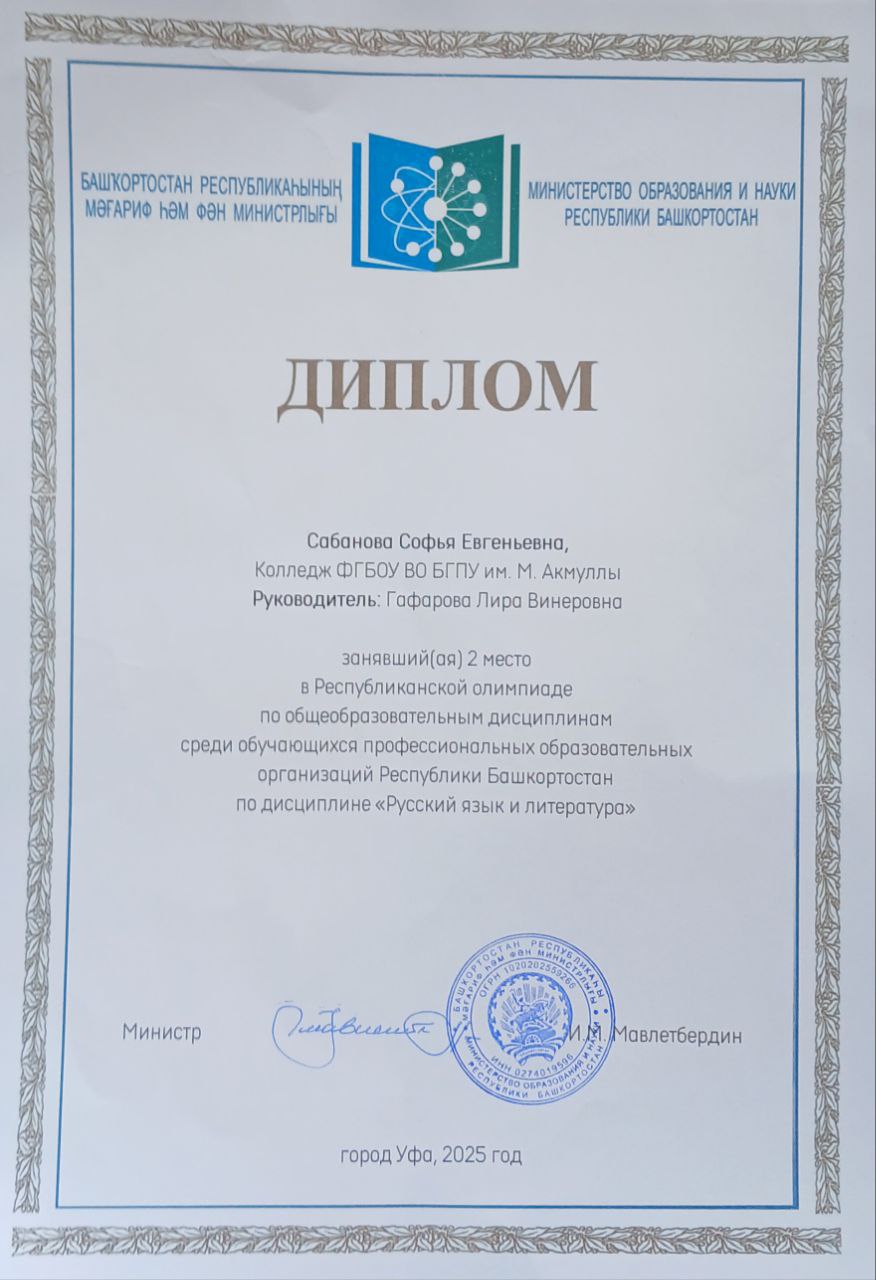 Поздравляем студентку 1 курса специальности «Преподавание в начальных классах» Колледжа БГПУ им. М. Акмуллы — Сабанову Софью, а также её руководителя — Гафарову Л.В. с почётным 2 местом!