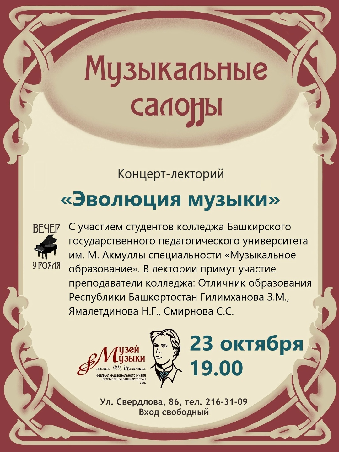 23 октября в зале «Мировая слава» Музея музыки им. Ф. И. Шаляпина с оглушительным успехом и при полном аншлаге прошел концерт-лекторий «Эволюция музыки: от классики до рок-н-ролла» с участием талантливых студентов специальности «Музыкальное образование» колледжа БГПУ им. М. Акмуллы.