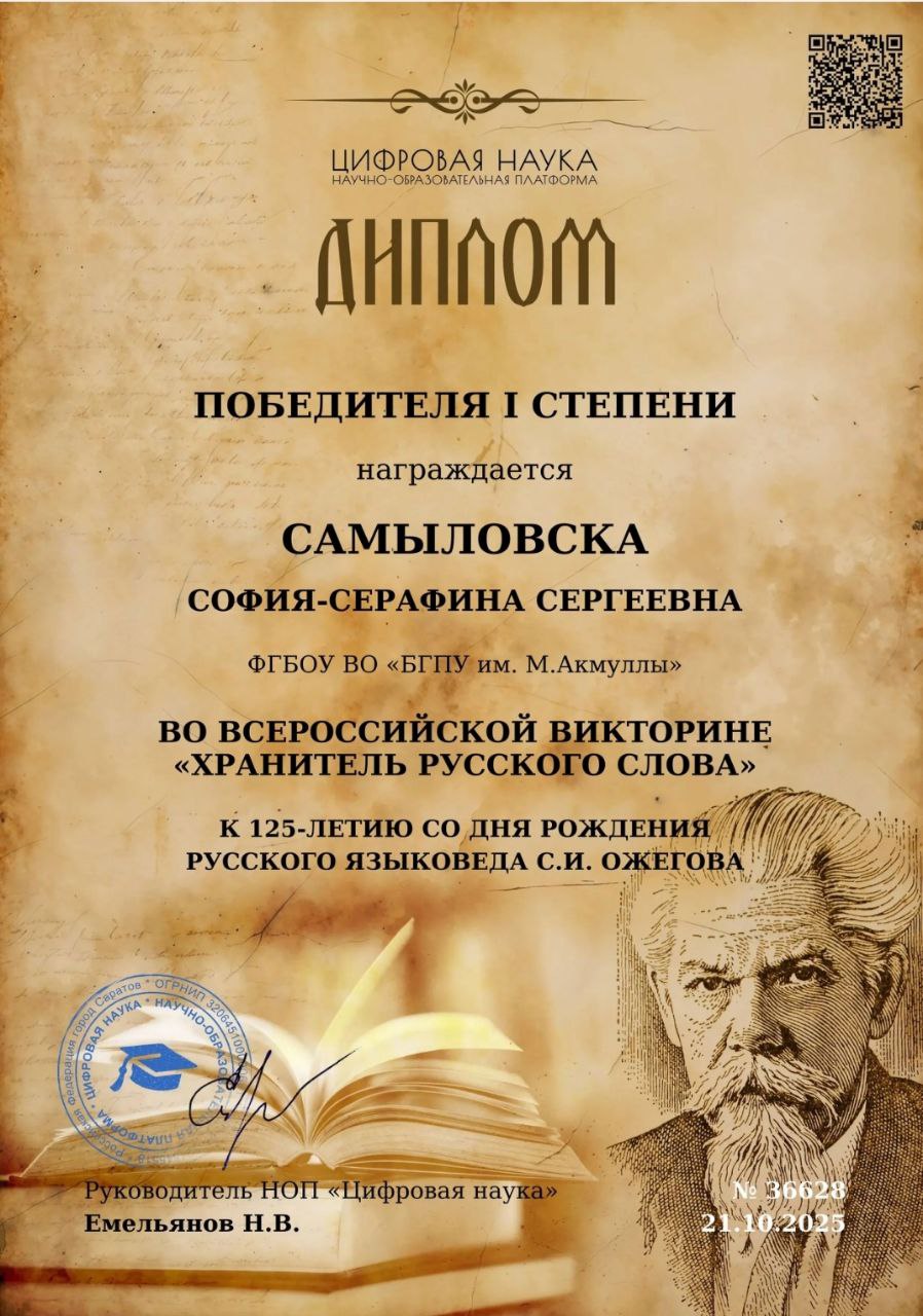 В честь 125-летия со дня рождения выдающегося русского языковеда Сергея Ивановича Ожегова состоялась Всероссийская викторина «Хранитель русского слова». Это значимое мероприятие, организованное научно-образовательным порталом «Цифровая наука»  (Сетевое издание «Цифровая наука», Свидетельство о регистрации СМИ ЭЛ No ФС77-78831 от 28.08.2020 г.). , было направлено на углубление знаний о русском языке, стимулирование интереса к лингвистике и повышение профессиональной компетентности будущих специалистов.