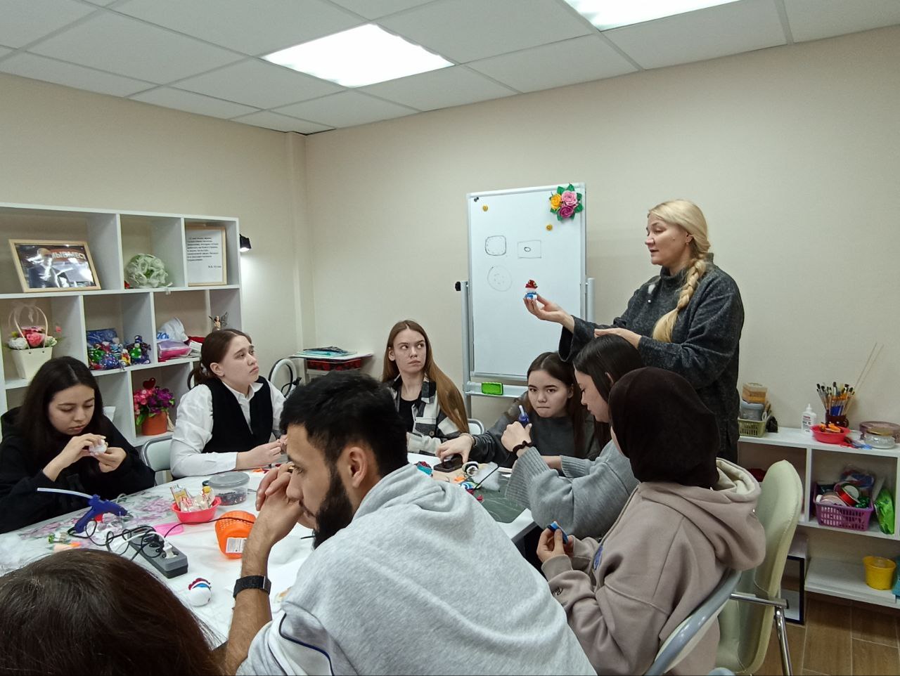 Вторая часть мероприятия привнесла нотки творчества и предновогоднего настроения. Участникам был предложен увлекательный мастер-класс по изготовлению новогодней игрушки — Снеговика. Ребята проявили творческий подход и с увлечением создавали свои поделки. Каждый изготовленный Снеговик обрёл особый смысл: студенты решили передать свои творения в поддержку наших солдат, участвующих в специальной военной операции. Этот жест стал символом тепла, заботы и веры в победу, отправленным нашим защитникам.