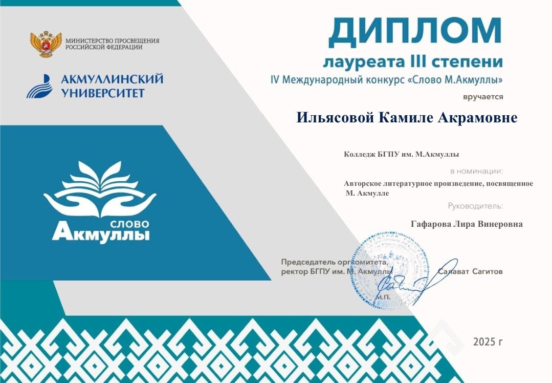 Галима Галина, доцент кафедры башкирского языка и литературы Акмуллинского университета и член жюри номинации «Лучшее прочтение произведений Акмуллы на русском и башкирском языках», особо отметила высокую активность студентов различных учебных заведений среднего профессионального и высшего образования. По ее словам, наибольшую активность проявили студенты Колледжа БГПУ им. М. Акмуллы. Среди отмеченных талантов – Газимова Амилия и Ильясова Камила (руководитель Гафарова Л.В.), которые были награждены дипломами III степени. Поздравляем их с заслуженной победой!