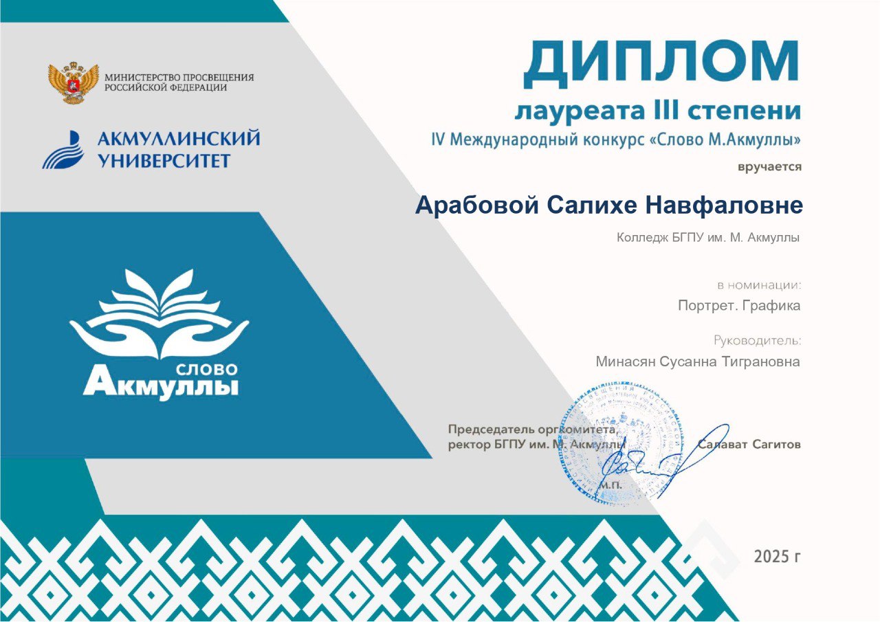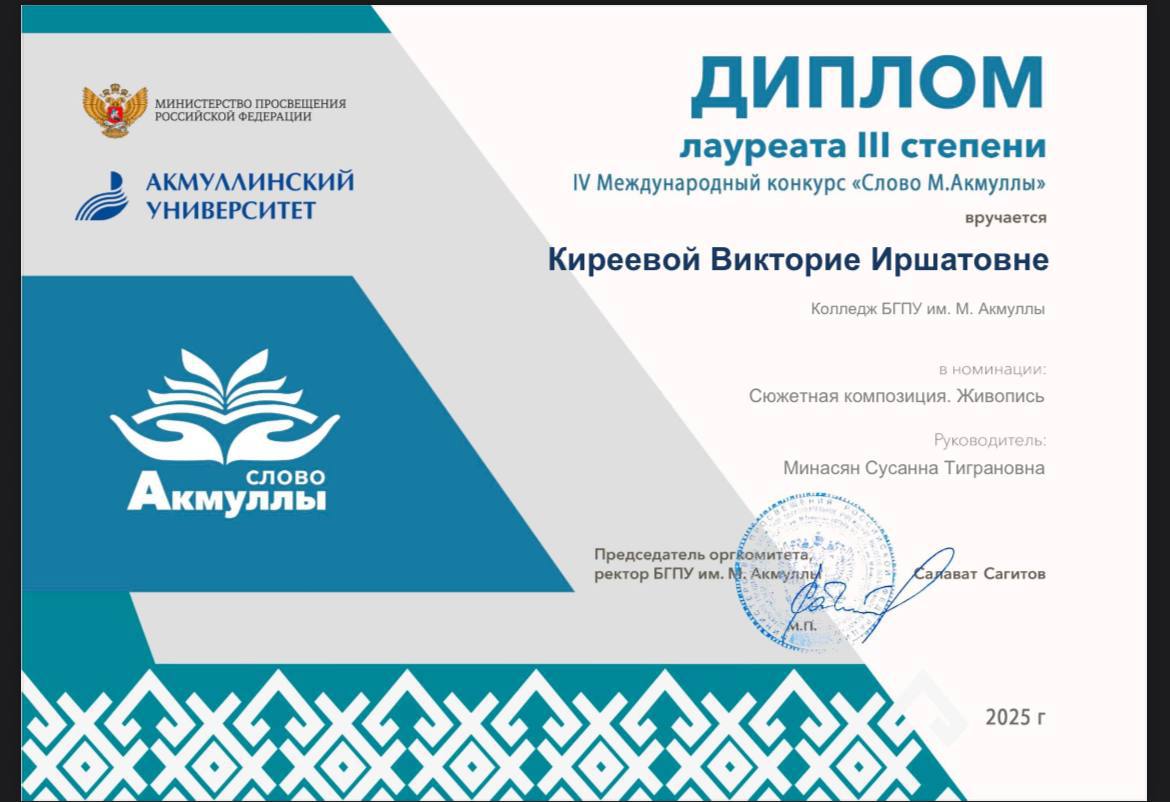 Лауреатами III степени стали студентки Киреева Виктория и Арабова Салиха в номинации «Изобразительное искусство (живопись, графика - работы, посвященные жизни и творческому наследию М. Акмуллы)».