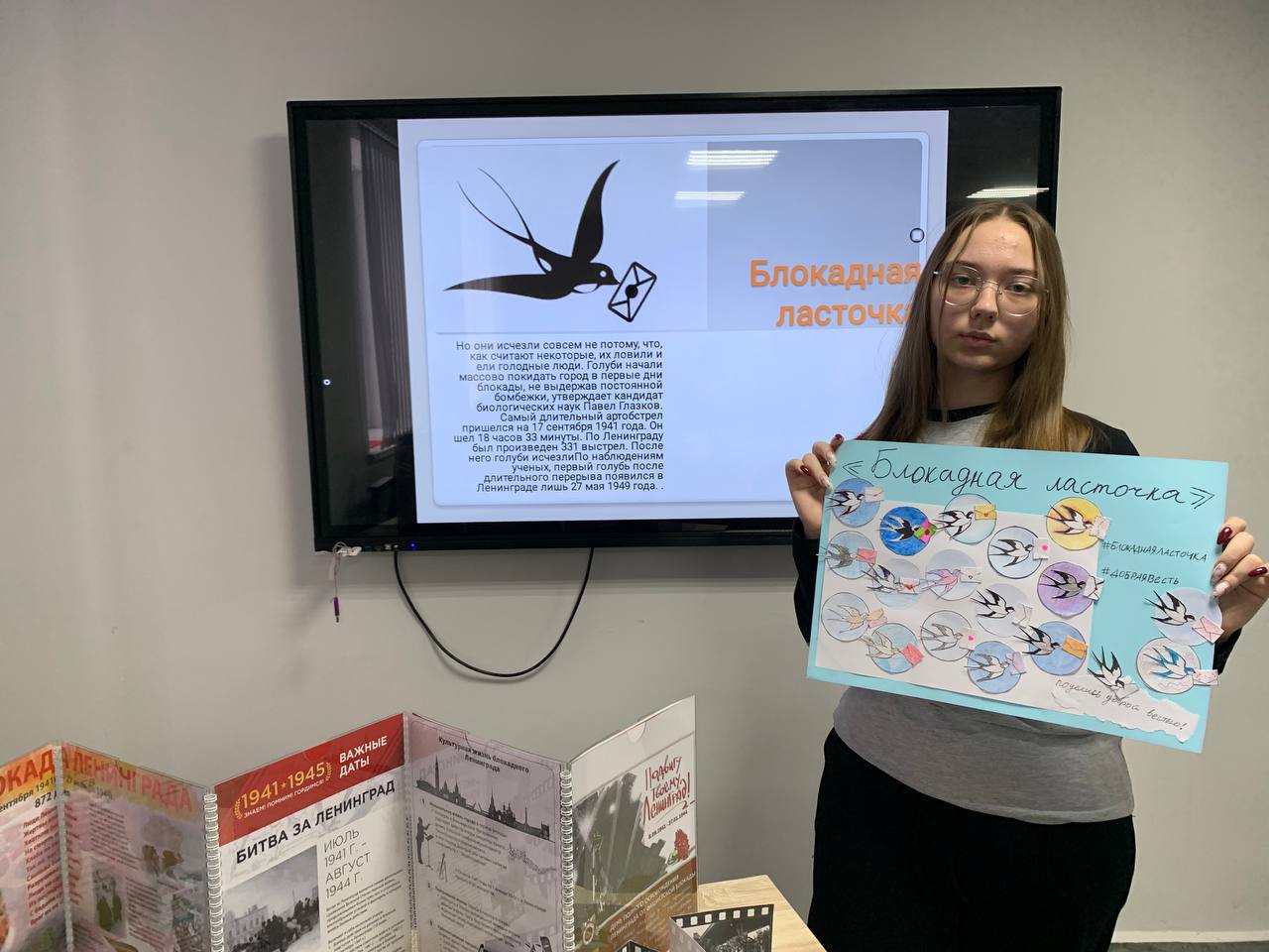 Особым моментом мероприятия стала творческая часть: студенты изготовили «Блокадную ласточку». Этот маленький жестяной значок в годы войны стал для ленинградцев ответом на нацистскую пропаганду, обещавшую, что в город «даже птица не пролетит». Ласточка стала символом надежды, весточки от близких и грядущей победы.