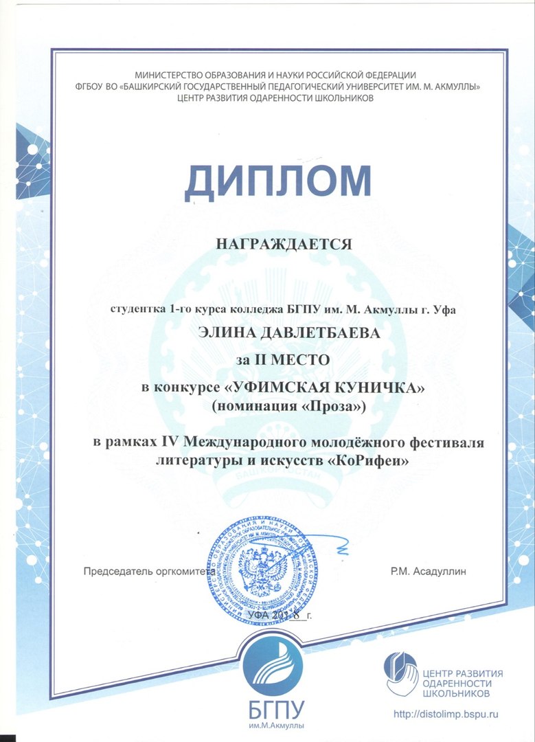 Студентка нашего учебного заведения Давлетбаева Элина приняла участие в этом фестивале. И была награждена дипломами: 1 место в конкурсе "Как наше слово отзовется...", 2 место в конкурсе "Уфимская куничка" (номинация "Проза"), 3 место в конкурсе "Уфимская куничка" (номинация "Публицистика").