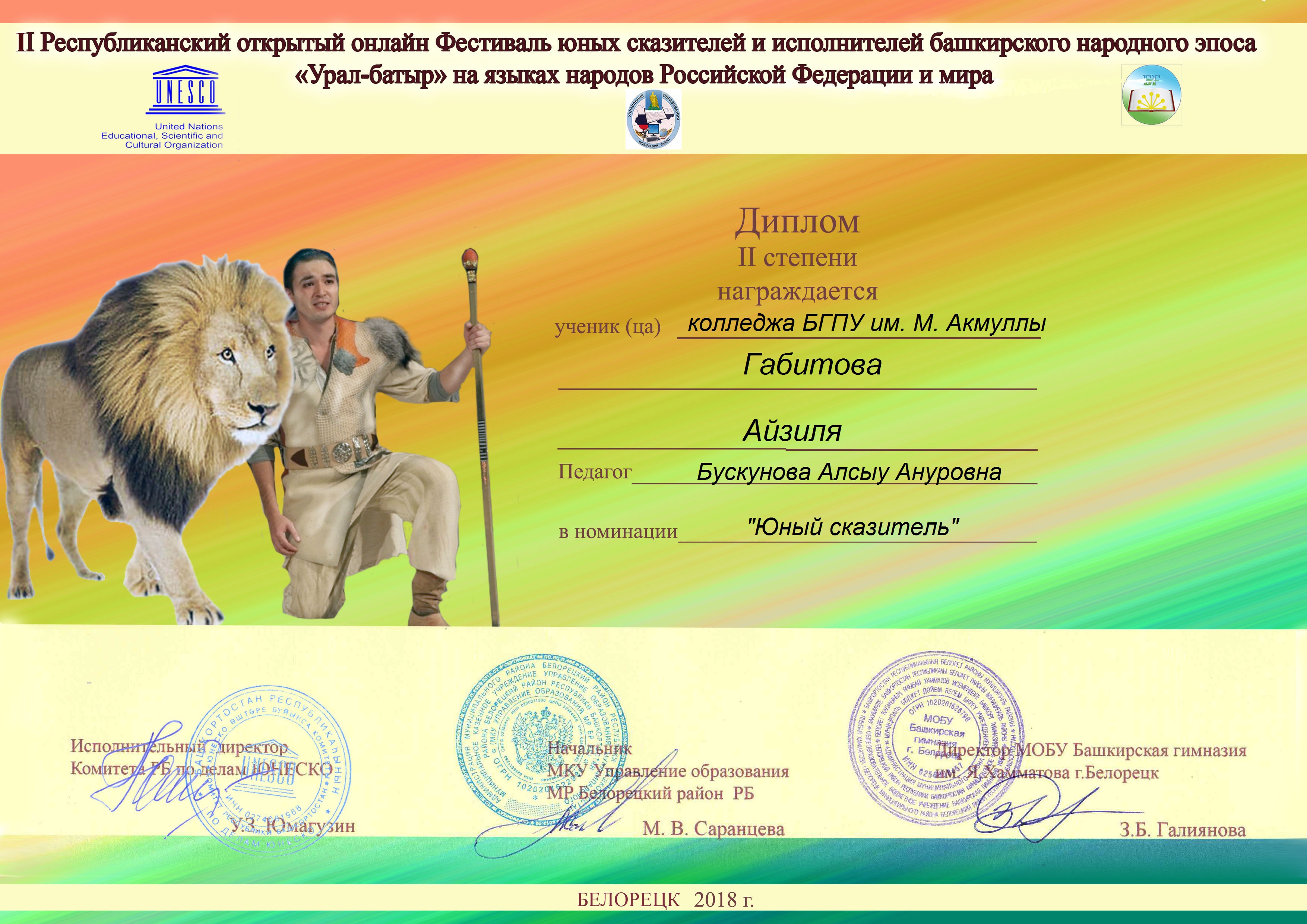 Прошел II Республиканский онлайн Фестиваль юных сказителей и исполнителей башкирского народного эпоса "Урал-батыр" на языках народов Российской Федерации и языках мира, посвященный 20-летию сотрудничества Республики Башкортостан с ЮНЕСКО. Конкурс был организован при поддержке Комитетом РБ по делам ЮНЕСКО РБ, МКУ Управления Белорецкого района и  Башкирской гимназии имени Я.Хамматова г. Белорецк.