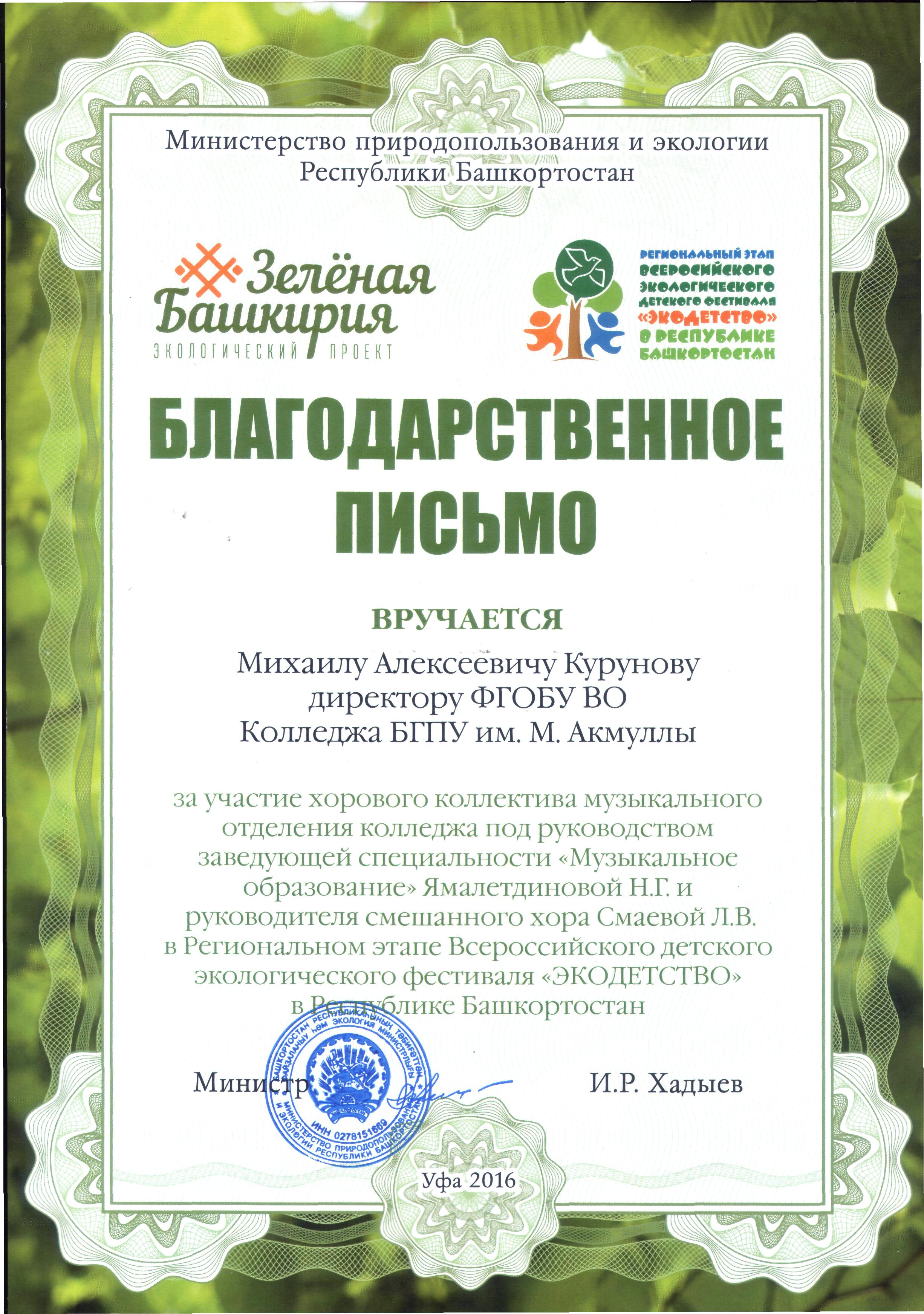 Завершилась конференция совместным исполнением всех участников научно-практической конференции гимна Второго Всероссийского экологического детского фестиваля «ЭКОДЕТСТВО», автором которого является выпускница колледжа и вуза БГПУ им. М. Акмуллы Юлия Юртова. Отрадно отметить, что этот Гимн впервые прозвучал в Уфе 8 июня 2016 года в выставочном комплексе «ВДНХ ЭКСПО» в исполнении хорового коллектива Колледжа и был удостоен благодарственного письма министра природопользования и экологии РБ Хадыева И. Р.