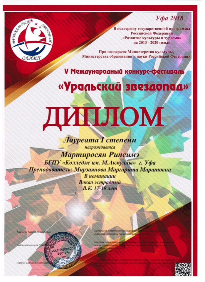 ​Студентка Колледжа БГПУ им.М.Акмуллы Рипсимэ Мартиросян стала Лауреатом I степени Международного конкурса-фестиваля "Уральский звездопад"