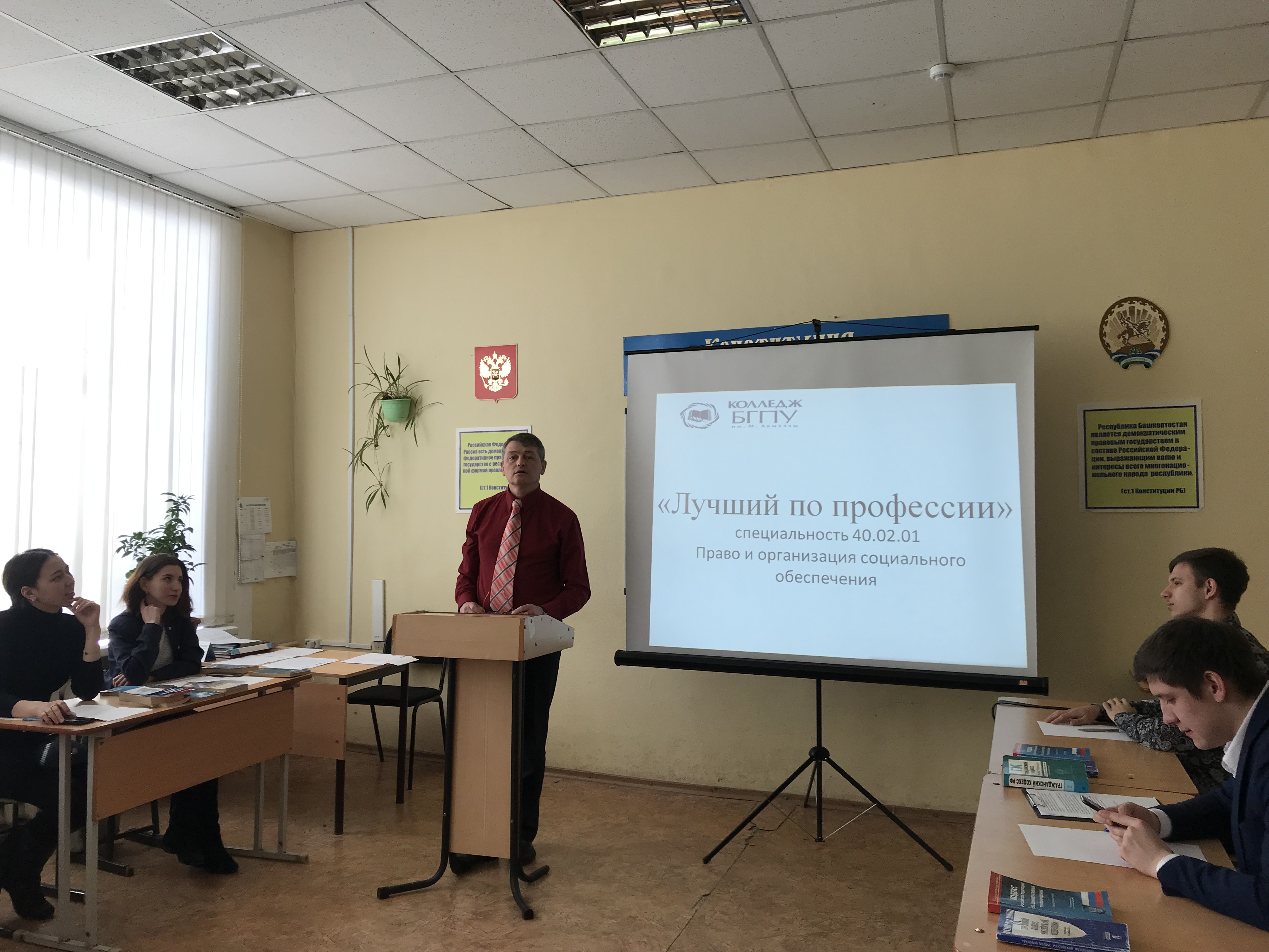 12 февраля состоялся конкурс «Лучший по профессии». Конкурсантами выступали также студенты третьего курса. Им предстояло пройти разные испытания: блиц-турнир, выполнение практических заданий и самое интересное  -  выступление на тему: «Почему я выбрал профессию юриста?» Выступления были  яркими, эмоциональными, участники отвечали на многочисленные вопросы, которые последовали от болельщиков и жюри. В результате конкурса места были распределены следующим образом: первое  место - Кишмария Давид; второе место - Киреева Минсылу; третье место – Шамилова Екатерина.