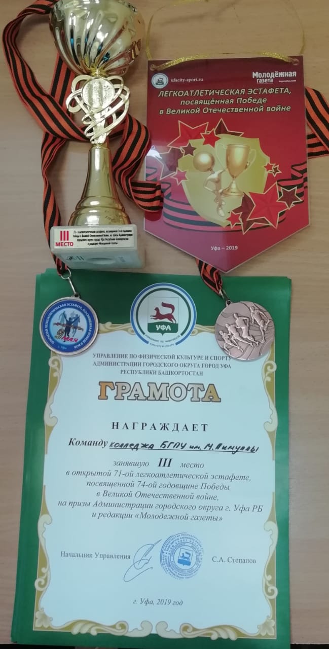 В уфимском  Парке Победы состоялась  легкоатлетическая эстафета, посвященная 74-й годовщине Победы в Великой Отечественной войне 1941-1945 годов на призы Администрации ГО город Уфа и редакции «Молодежной газеты». Третье место в эстафете заняла Сборная Колледжа БГПУ им.М.Акмуллы,  в состав которой вошли студенты специальности «Физическая культура».