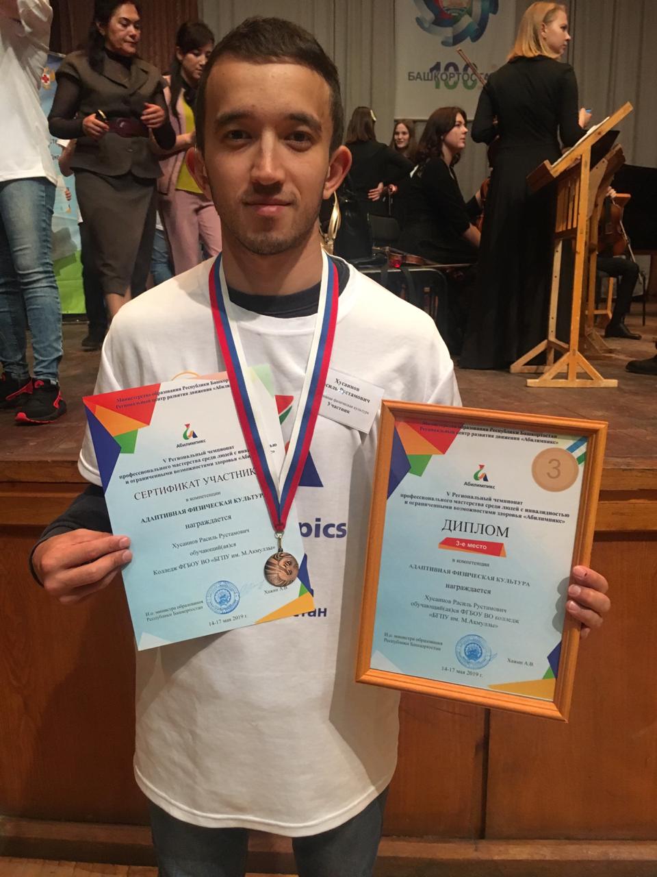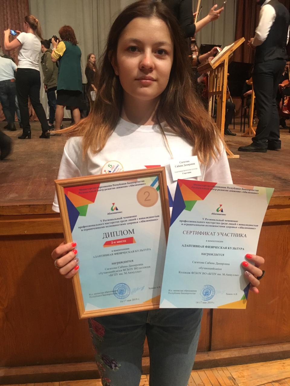 В Республике Башкортостан c 14 по 17 мая 2019 года состоялся V Региональный отборочный этап Национального чемпионата профессионального мастерства “Абилимпикс” среди людей с инвалидностью и ограниченными возможностями здоровья. Участники конкурса показали своё мастерство на площадках 8 профессиональных образовательных организаций городов Уфа, Стерлитамак, Салават. Студенты Колледжа приняли участие в конкурсе по компетенциям «Адаптивная физическая культура», «Туризм», «Обработка текста».По компетенциям «Адаптивная физическая культура» второе  место заняла студентка второго курса специальности «Физическая культура» Сагитова Сабина, третье место - Хусаинов Расиль студент третьего курса. По компетенциям «Туризм»  второе место заняла студентка второго курса специальности «Туризм» Полякова Валерия.