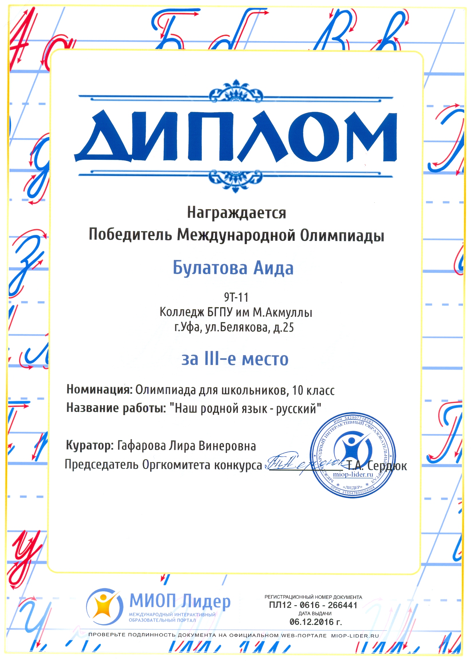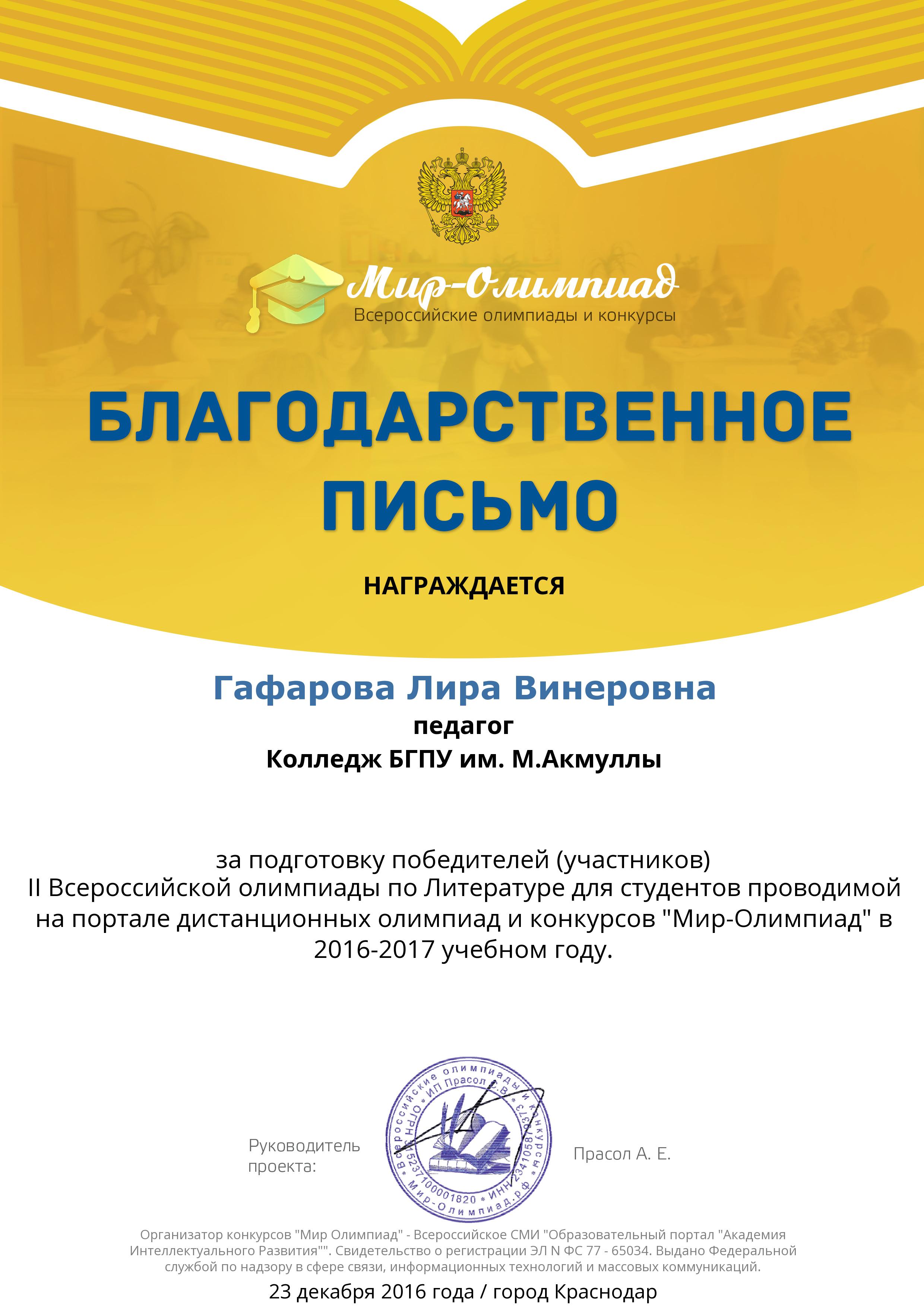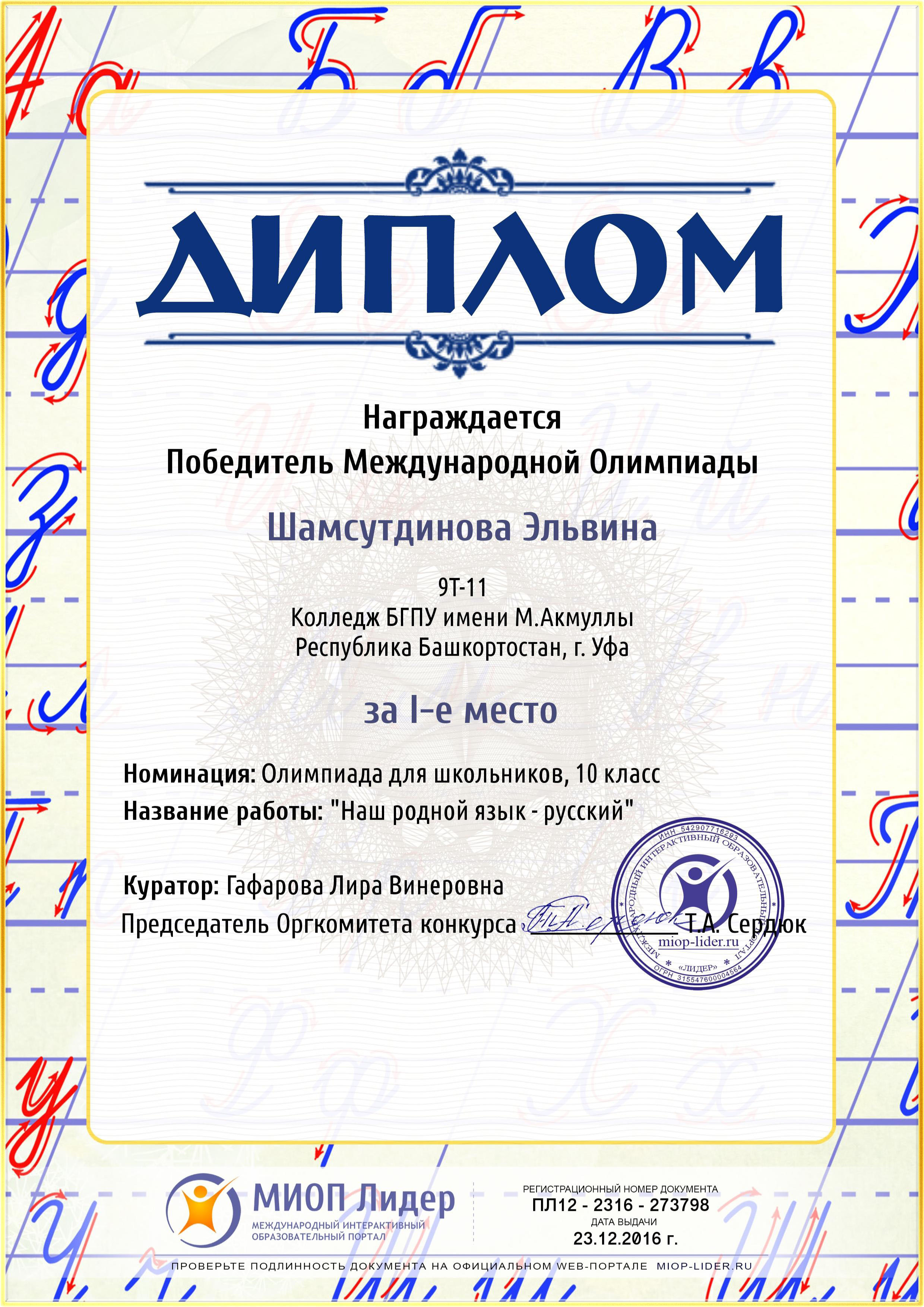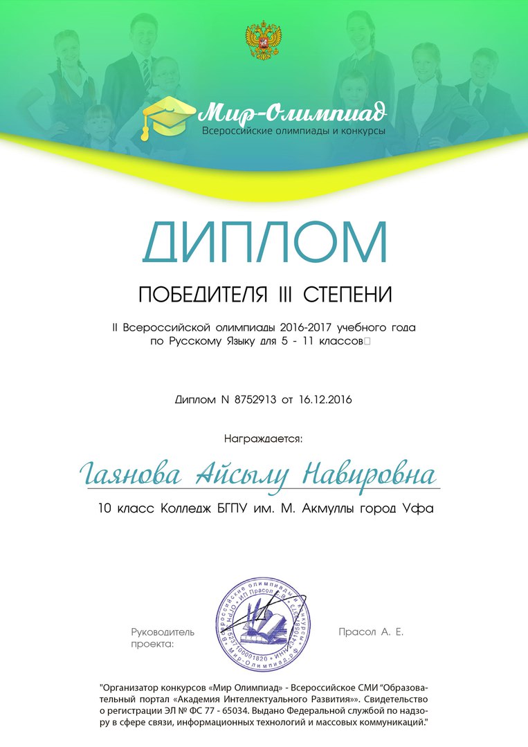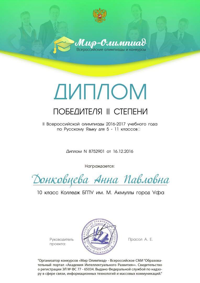 Поздравляем студентов Колледжа БГПУ им. М.Акмуллы (руководитель Л.В.Гафарова), занявших призовые места в олимпиадах по русскому языку и литературе! III Международный конкурс «Мириады открытий» проекта «Инфоурок» по русской и зарубежной литературе «Мифы разных времен и народов»: 1 место Мифтахова Д., Мухамадеева Е. – 9Б11. Международная олимпиада для школьников в режиме ОНЛАЙН на Международном интерактивном образовательном портале «Лидер»: 1 место Шамсутдинова Э. – 9Т-11, Тимаков К. – 9 ПО-11. 2 место Абдулов И. – 9Т-11. 3 место Булатова А. – 9Т-11, Габдулнафикова А. – 9Т-22. III Международный конкурс «Мириады открытий» проекта «Инфоурок» по русскому языку: 1 место Еникеева В., Зарипова Г. – 9Б-11. Международная онлайн-олимпиада на портале «Центр Европейского образования»: 2 место Мустафаева И. – 9Б-11. Всероссийская олимпиада по русскому языку от проекта mega-talant.com: 1 место Чиглинцев С., Фабарисова Н. – гр.9Т-11. 3 место Зилеева А. – гр. 9Т-11. II Всероссийская олимпиада по русскому языку на портале дистанционных олимпиад и конкурсов «Мир олимпиад»: 2 место Галимова А., Донковцева А., Панкратова А. – 9Э-11. 3 место Адильмурзина А., Гаянова А., Хайбрахманова Р. – 9Э-11. Всероссийская онлайн-олимпиада на сайте «Я - гений»: 1 место Конаева И. – 9Т-11. 2 место Сахипова К. – 9Т-11.