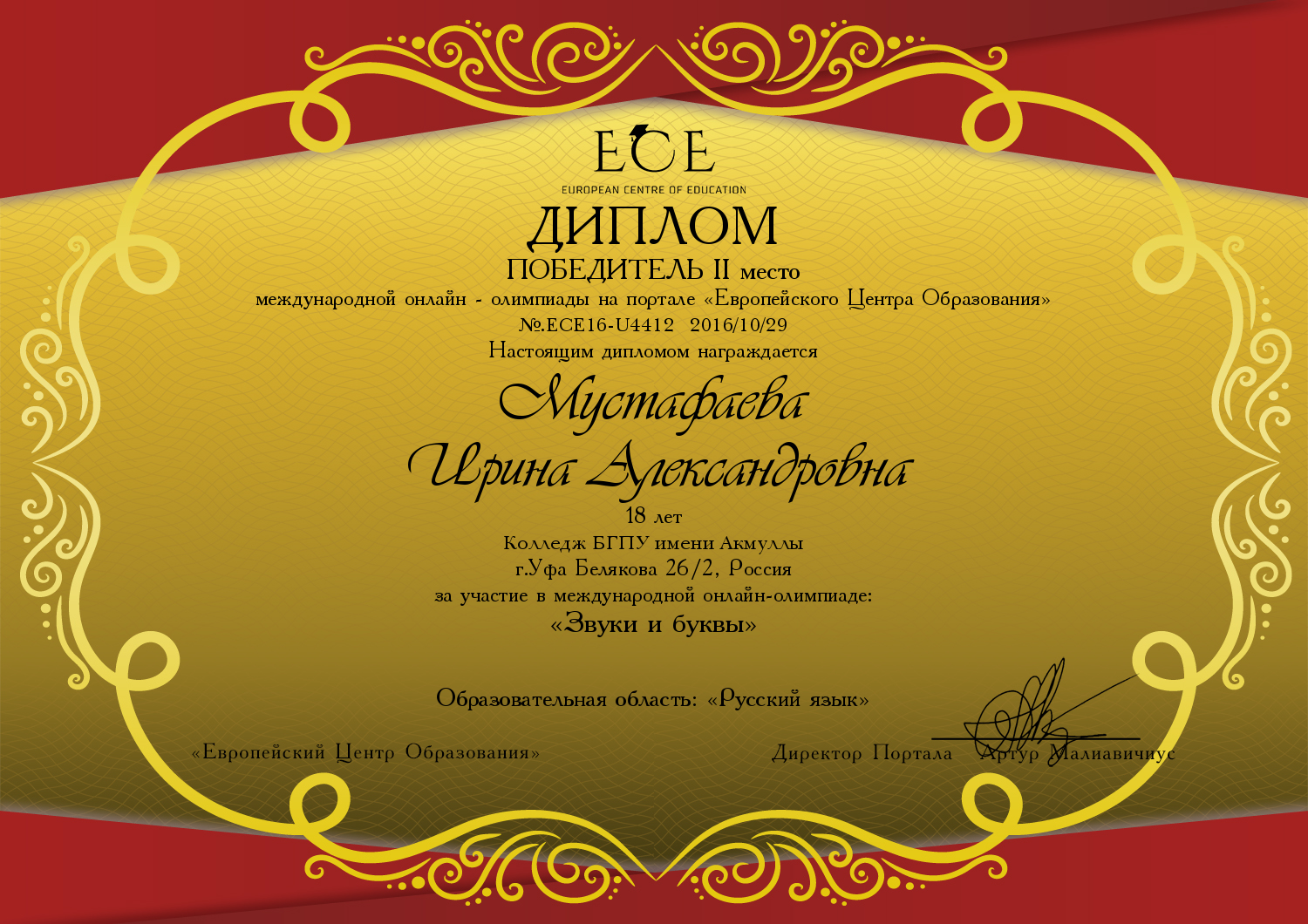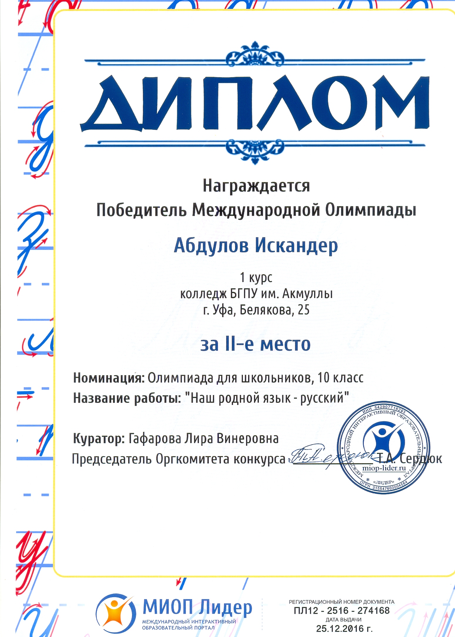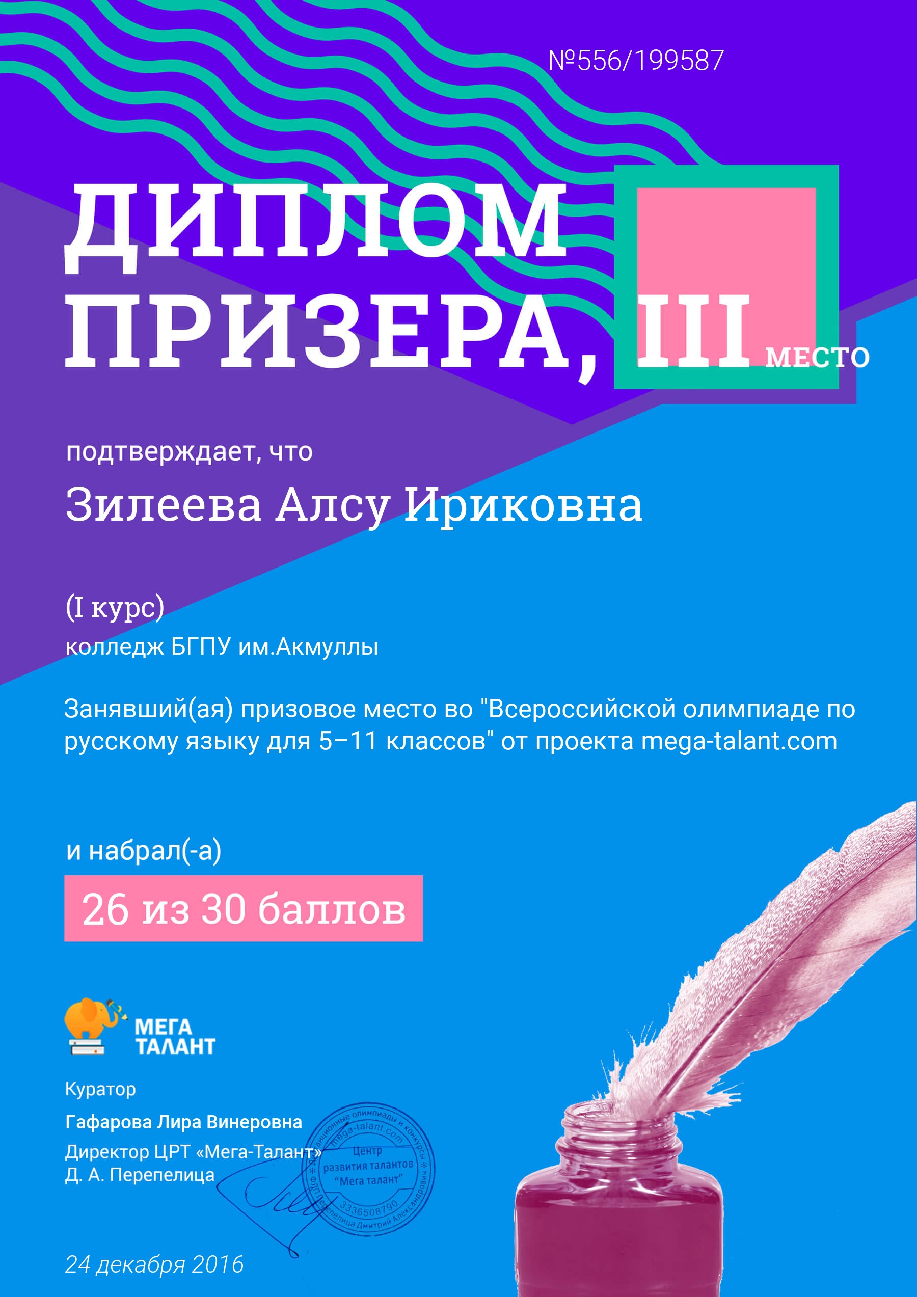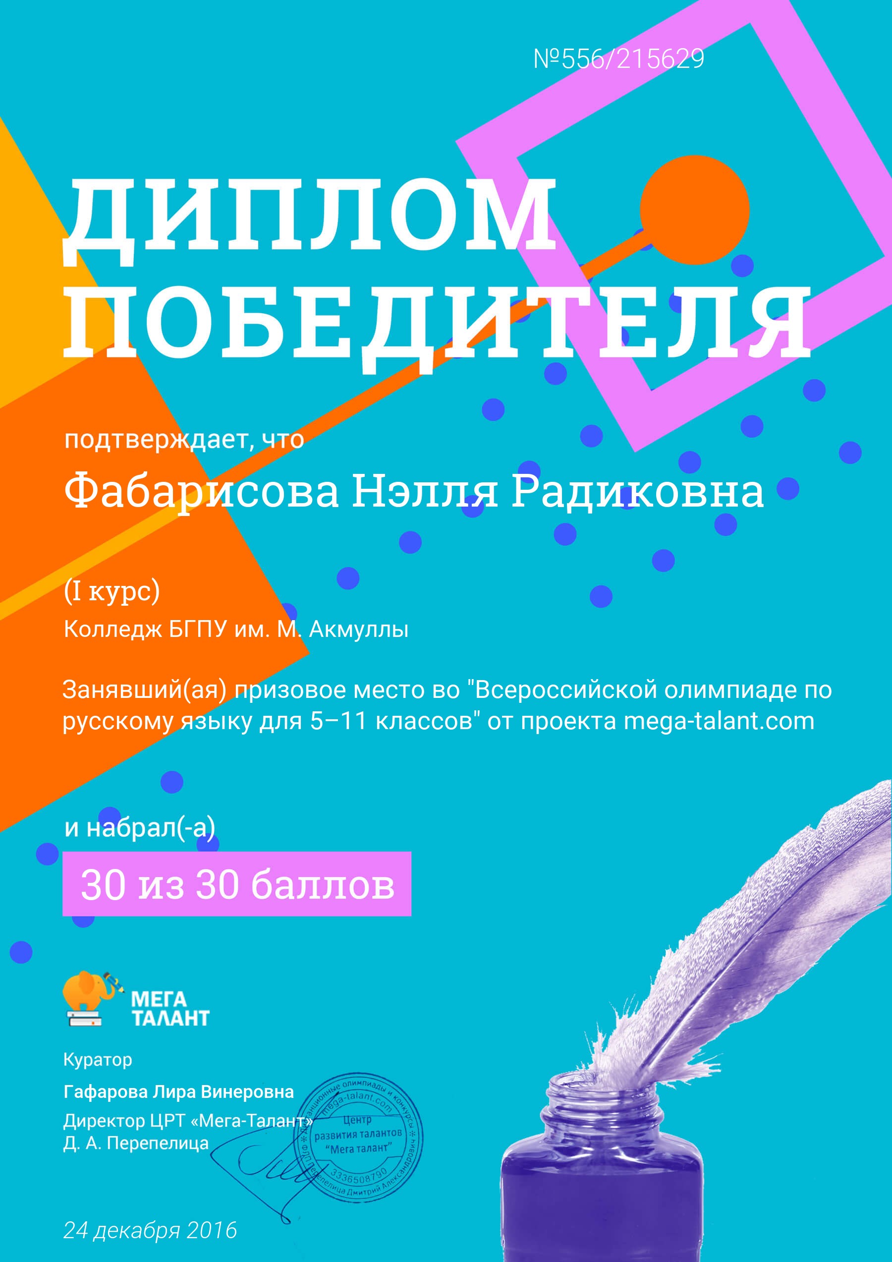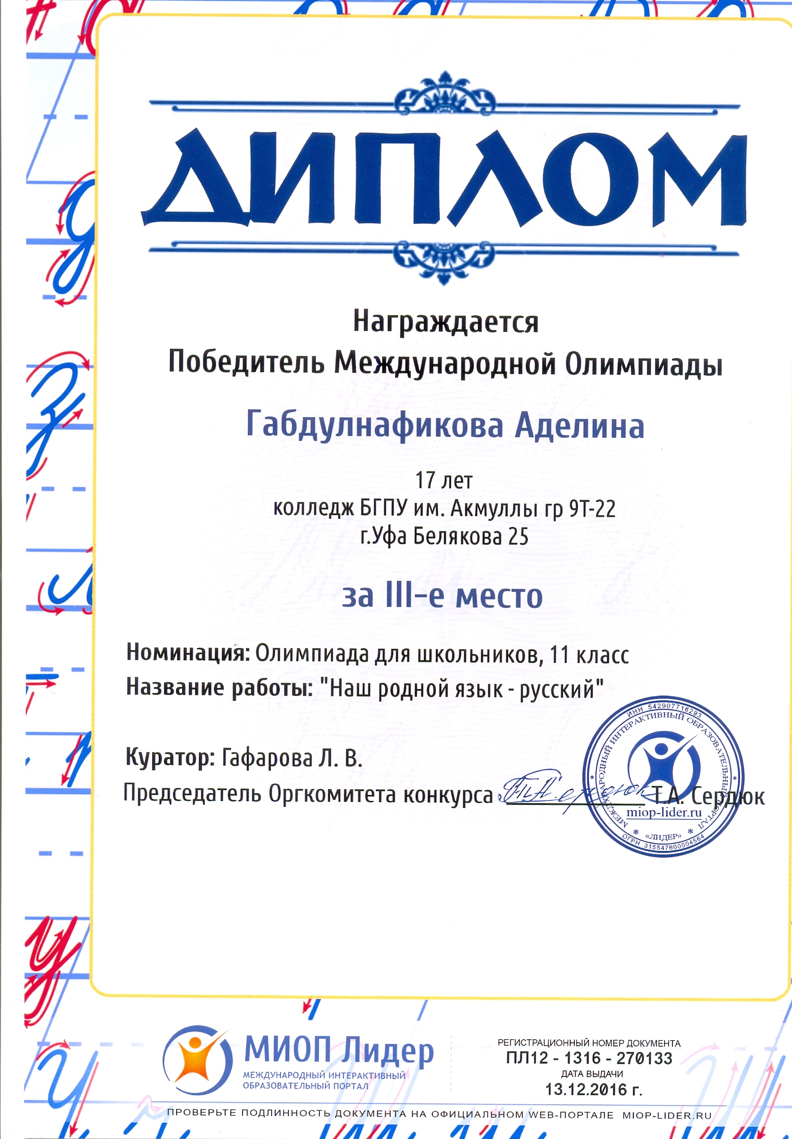 Поздравляем студентов Колледжа БГПУ им. М.Акмуллы (руководитель Л.В.Гафарова), занявших призовые места в олимпиадах по русскому языку и литературе! III Международный конкурс «Мириады открытий» проекта «Инфоурок» по русской и зарубежной литературе «Мифы разных времен и народов»: 1 место Мифтахова Д., Мухамадеева Е. – 9Б11. Международная олимпиада для школьников в режиме ОНЛАЙН на Международном интерактивном образовательном портале «Лидер»: 1 место Шамсутдинова Э. – 9Т-11, Тимаков К. – 9 ПО-11. 2 место Абдулов И. – 9Т-11. 3 место Булатова А. – 9Т-11, Габдулнафикова А. – 9Т-22. III Международный конкурс «Мириады открытий» проекта «Инфоурок» по русскому языку: 1 место Еникеева В., Зарипова Г. – 9Б-11. Международная онлайн-олимпиада на портале «Центр Европейского образования»: 2 место Мустафаева И. – 9Б-11. Всероссийская олимпиада по русскому языку от проекта mega-talant.com: 1 место Чиглинцев С., Фабарисова Н. – гр.9Т-11. 3 место Зилеева А. – гр. 9Т-11. II Всероссийская олимпиада по русскому языку на портале дистанционных олимпиад и конкурсов «Мир олимпиад»: 2 место Галимова А., Донковцева А., Панкратова А. – 9Э-11. 3 место Адильмурзина А., Гаянова А., Хайбрахманова Р. – 9Э-11. Всероссийская онлайн-олимпиада на сайте «Я - гений»: 1 место Конаева И. – 9Т-11. 2 место Сахипова К. – 9Т-11.