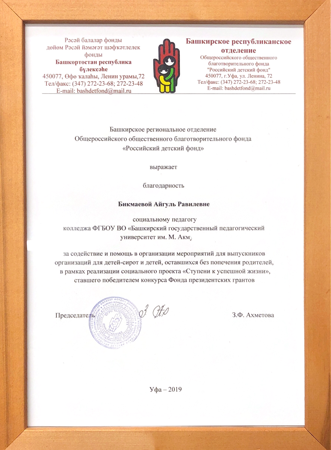 Социальный педагог колледжа Бикмаева Айгуль Равилевна стала участником данного мероприятия. Приняла участие в обсуждении вопросов на тематических площадках и посетила мастер- классы. По итогам проекта «Ступени к успешной жизни», разработанного Управлением по опеке и попечительству Администрации городского округа город Уфа Республики Башкортостан совместно с Башкирским республиканским отделением Общероссийского общественного благотворительного фонда «Российский детский фонд» Бикмаева А.Р. награждена Благодарственным письмом. Всероссийский семинар-стажировка «Синергия ресурсов мегаполиса на благо детства» стал отличной образовательной площадкой для специалистов. Участники смогли узнать о новых эффективных практиках, действенных инструментах и поделиться своим профессиональным опытом.