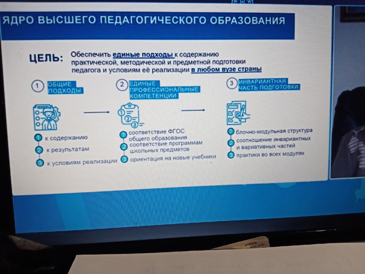 • методологические основы формирования Ядра высшего педагогического образования; нормативные правовые акты и организационно-методические основы организации образовательного процесса по программам ВО, особенности структуры образовательных программ подготовки педагога в соответствии с принципами «Ядра высшего педагогического образования»;