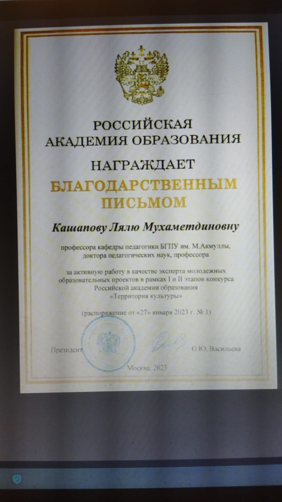 Профессор кафедры педагогики, Кашапова Ляля Мухаметдиновна, награждена благодарственным письмом за активную работу в качестве эксперта молодежных образовательных проектов в рамках I и II этапов конкурса Российской академии образования "Территория культуры"
