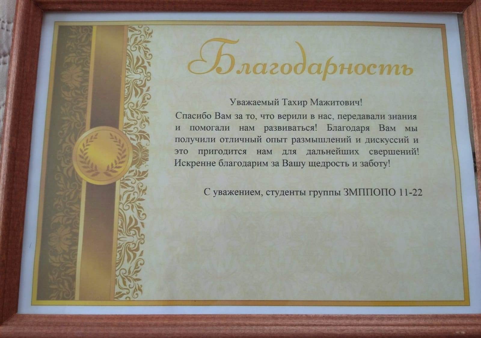 Студенты группы ЗМППОПО-11-22 выражает благодарность доктору педагогических наук, профессору кафедры педагогики Тахиру Мажитовичу Аминову за высокий профессионализм.