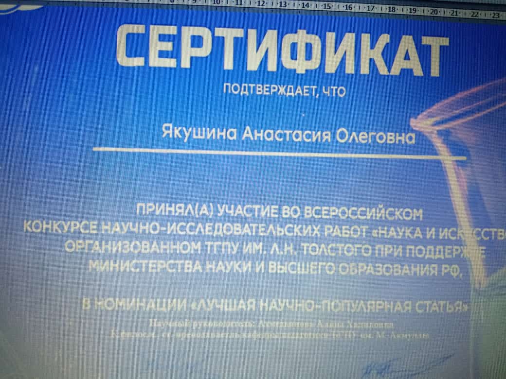 Студентка 1 курса Института педагогики (профиль «Дополнительное образование (воспитательная работа и история») Якушина Анастасия под руководством Алины Халиловны Ахмедьяновой - к.филос.н., ст. преподавателя кафедры педагогики,  приняла участие во Всероссийском конкурсе научно-исследовательских работ «Наука и искусство». Награждена сертификатом за участие.