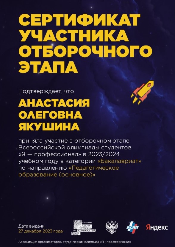 Студентка 1 курса Института педагогики - Якушина Анастасия приняла участие во Всероссийской олимпиаде для студентов по направлению "Педагогические науки", Педагогическое образование (основное). В определенные дни необходимо было пройти тестирование на время. Представлены были вопросы профессионального и более практического характера.