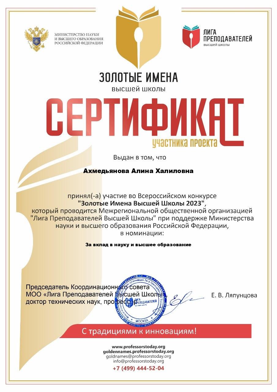 Старший преподаватель кафедры педагогики Ахмедьянова Алина Халиловна приняла участие во Всероссийском конкурсе "Золотые Имена Высшей Школы 2023", который проводится Межрегиональной общественной организацией "Лига Преподавателей Высшей Школы" при поддержке Министерства науки и высшего образования Российской Федерации, в номинации: За вклад в науку и высшее образование