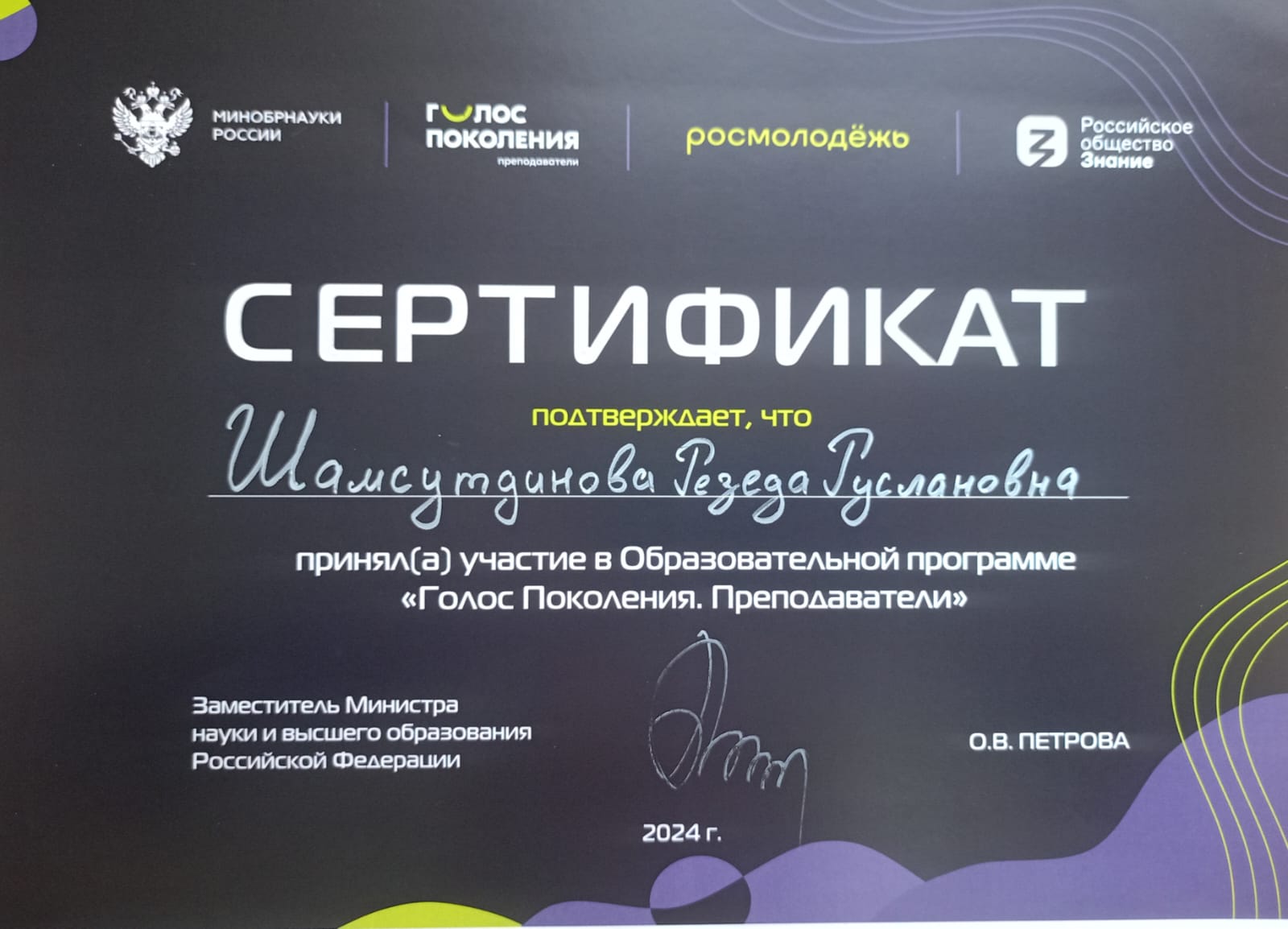 1 и 2 ноября 2024 г. преподаватель кафедры педагогики Шамсутдинова Резеда Руслановна приняла участие в образовательной программе «Голос поколения. Преподаватели» (г. Уфа).
