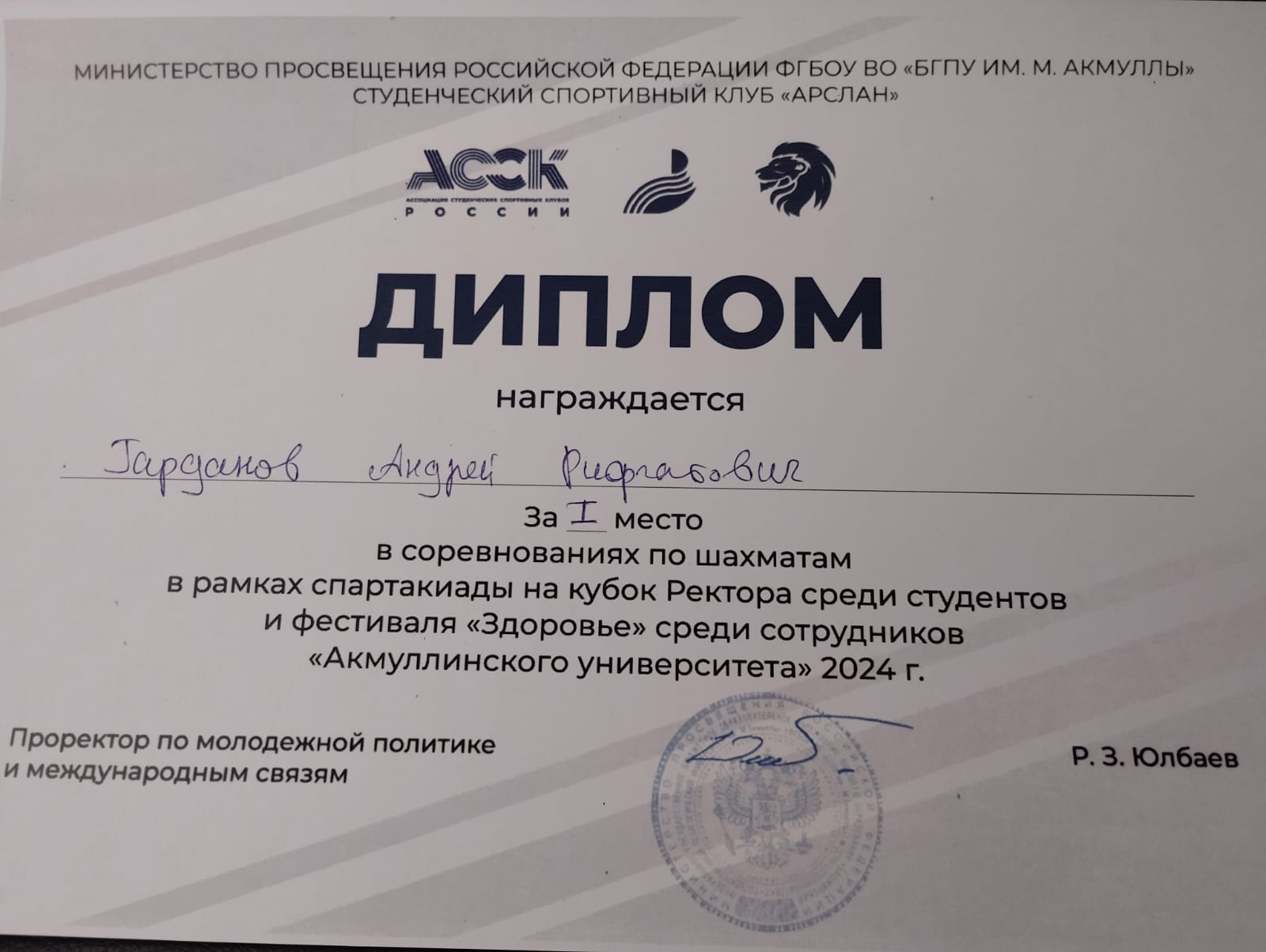 Доцент кафедры педагогики Андрей Рифгатович Гарданов стал победителем в соревнованиях по шахматам в рамках спартакиады на кубок Ректора среди студентов и фестиваля "Здоровье" среди сотрудников "Акмуллинского университета 2024 г.".