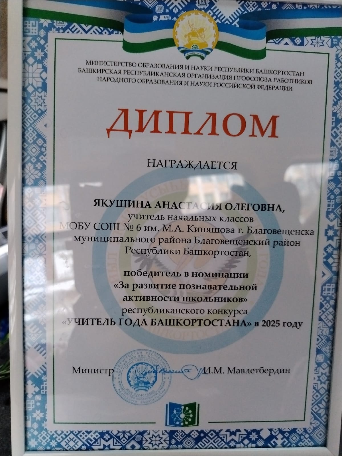 В нашем регионе состоялось торжественное награждение победителей республиканского конкурса «Учитель года». В этом году особое внимание было уделено достижениям педагогов, способствующих развитию познавательной активности школьников. В числе лауреатов оказалась Якушина Анастасия Олеговна, студентка 2 курса группы ОЗПВРИС-21-23 и учитель начальных классов, чья работа вдохновляет учеников на новые открытия и достижения. Ее подход к обучению, основанный на активном взаимодействии с учениками и использовании современных технологий, стал примером для многих коллег.