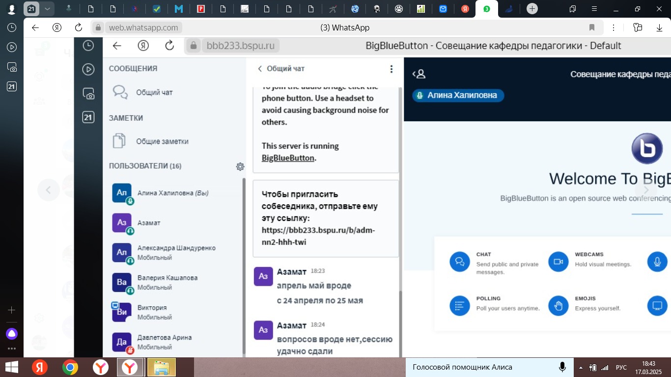 Заведующий кафедрой педагогики Алина Халиловна Ахмедьянова 17 марта провела собрание для студентов группы ЗПОСПОВД-11-24 по итогам зимней сессии. С ребятами была проведена беседа по вопросам закрытия долгов по определенным дисциплинам. А также привлечение наших студентов к различным конкурсам и мероприятиям.