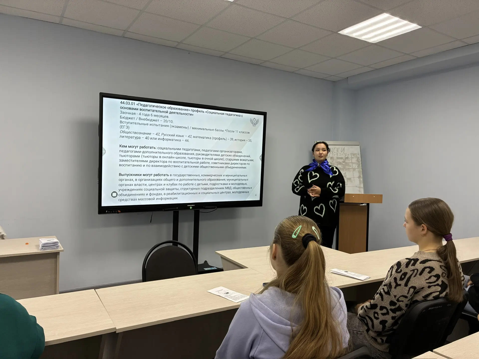 Студенты рассказали про основные направления кафедры педагогики, провели мастер-класс по Вожатской деятельности, также познакомили с олимпиадами, за которые дают отдельные баллы при поступлении. Обучающиеся внимательно слушали и задавали интересующиеся вопросы.
