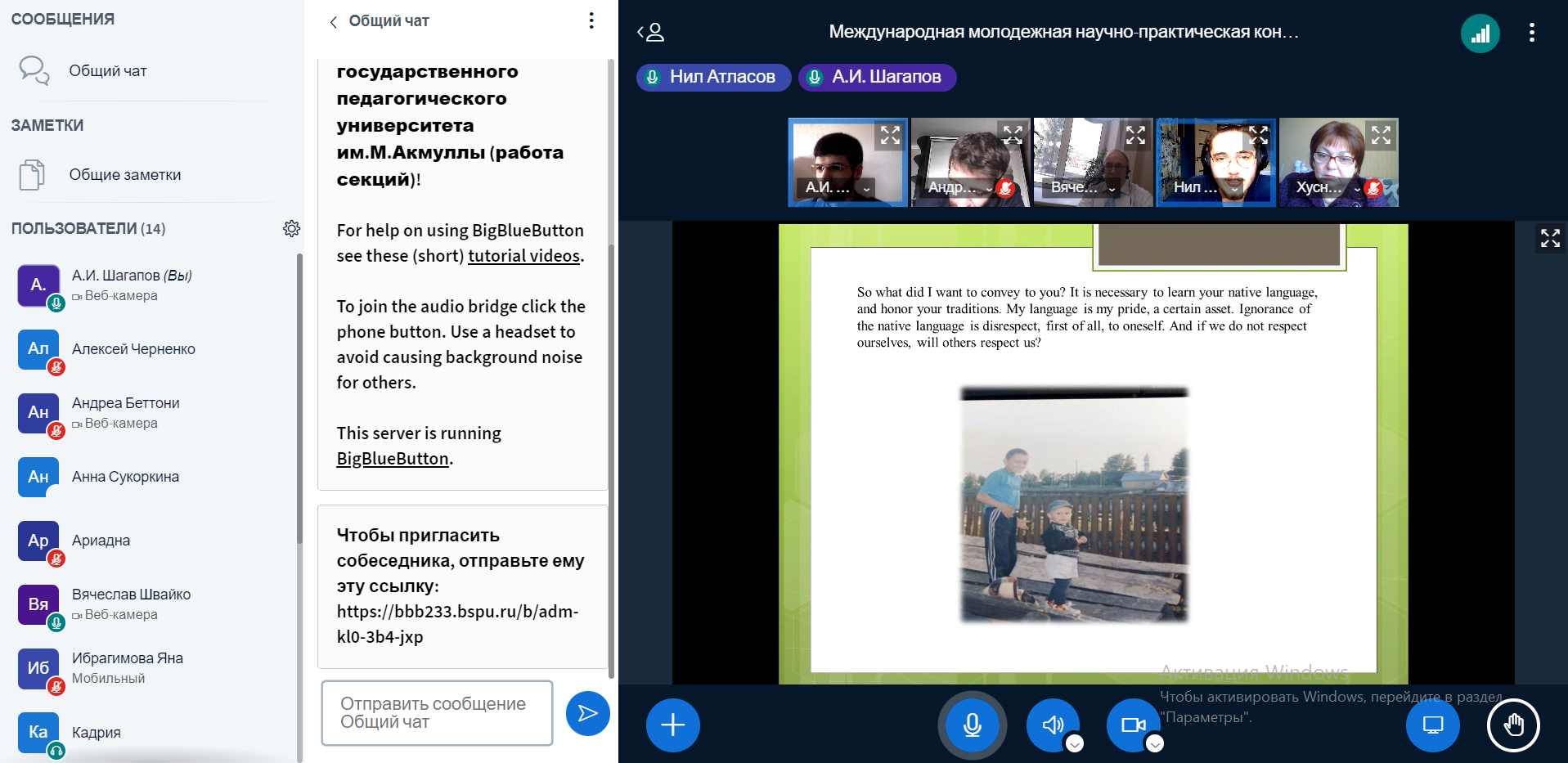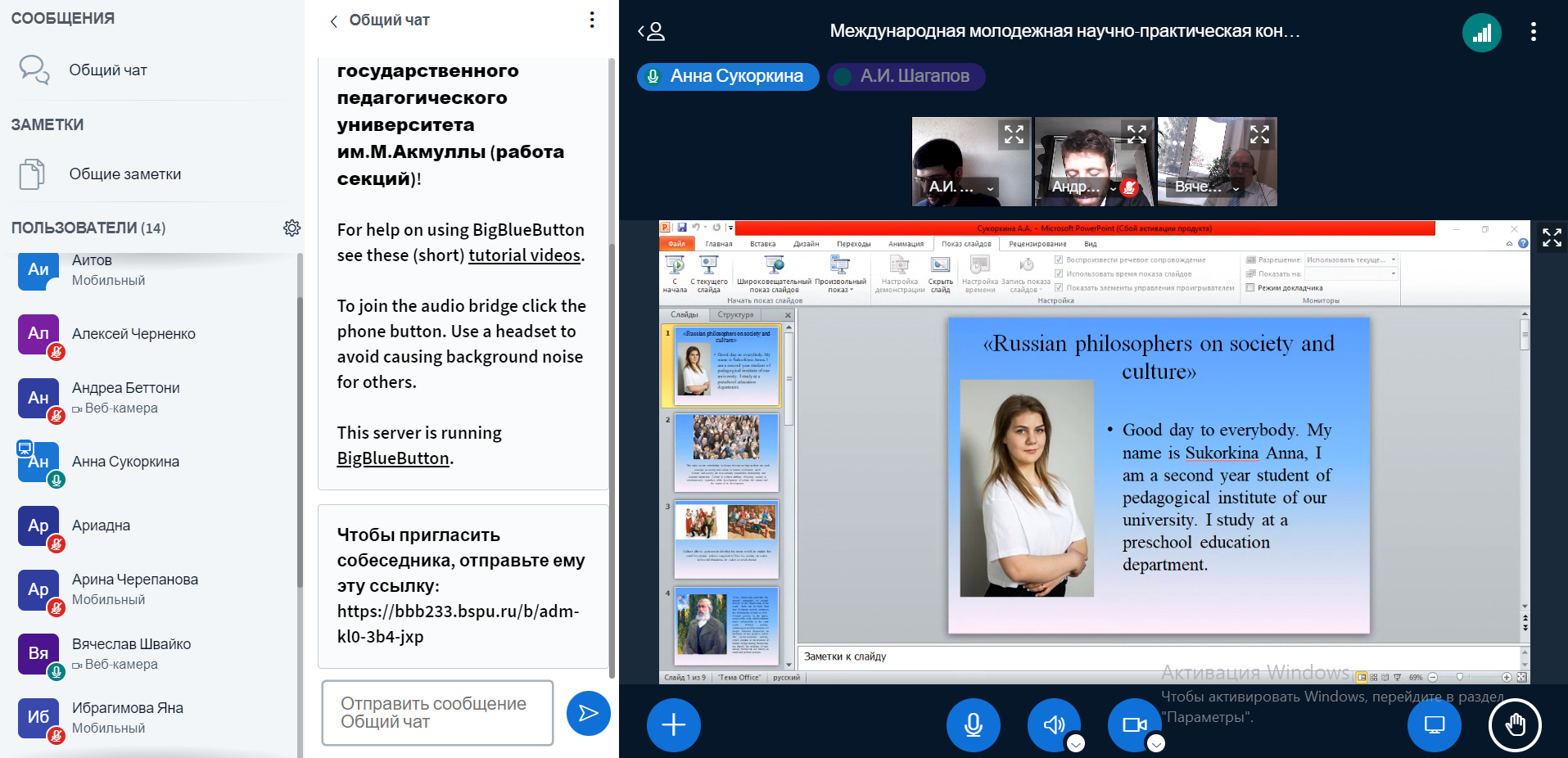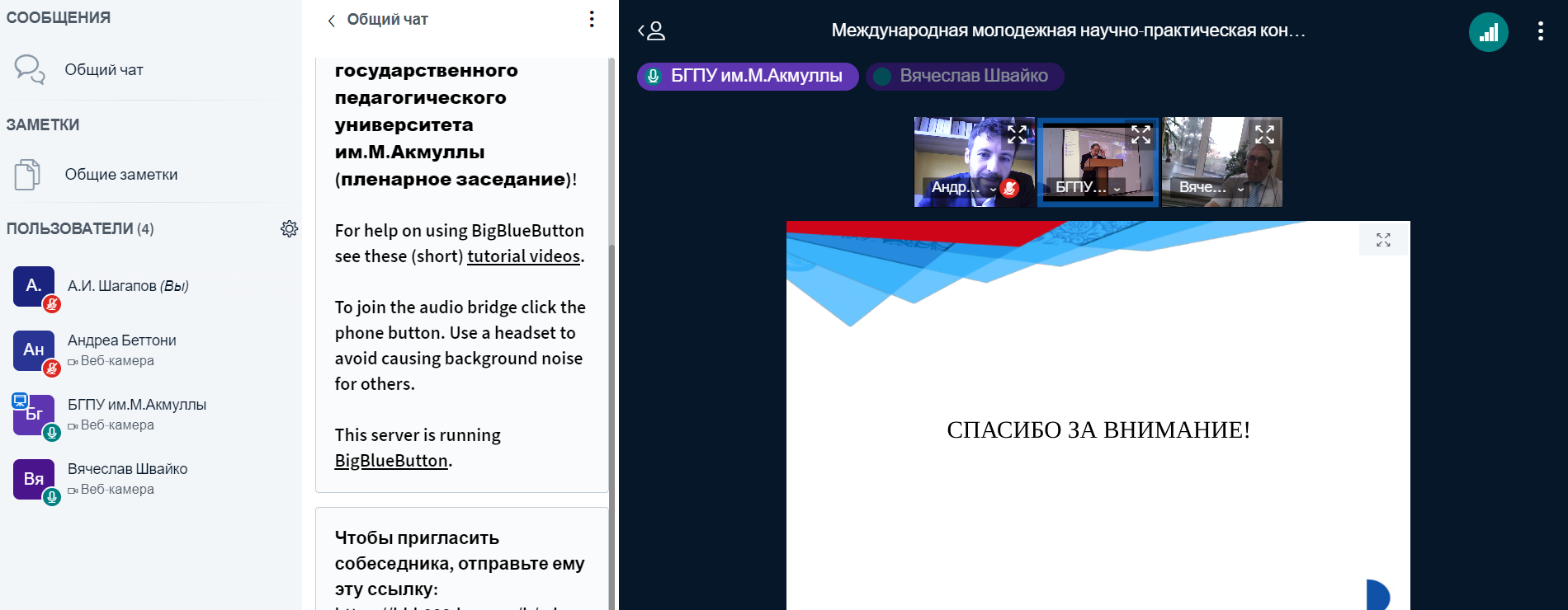 21 апреля в рамках XVIII Международной молодежной научно-практической конференции «Человек. Общество. Культура. Социализация» была организована дистанционная работа секции на английском языке “Current issues in the humanities and social sciences” («Актуальные проблемы гуманитарных и социальных наук»). В этом году за проведение секции отвечали преподаватели Института филологического образования и межкультурных коммуникаций: В.Д. Швайко, Ф.А. Хуснутдинова, А.И. Шагапов. В начале секционного заседания слово было предоставлено иностранному гостю – Андреа Беттони, выпускнику факультета политических и социальных наук университета г. Милан, который в ходе своего выступления отметил высокую значимость межкультурного диалога между высшими учебными заведениями разных стран.